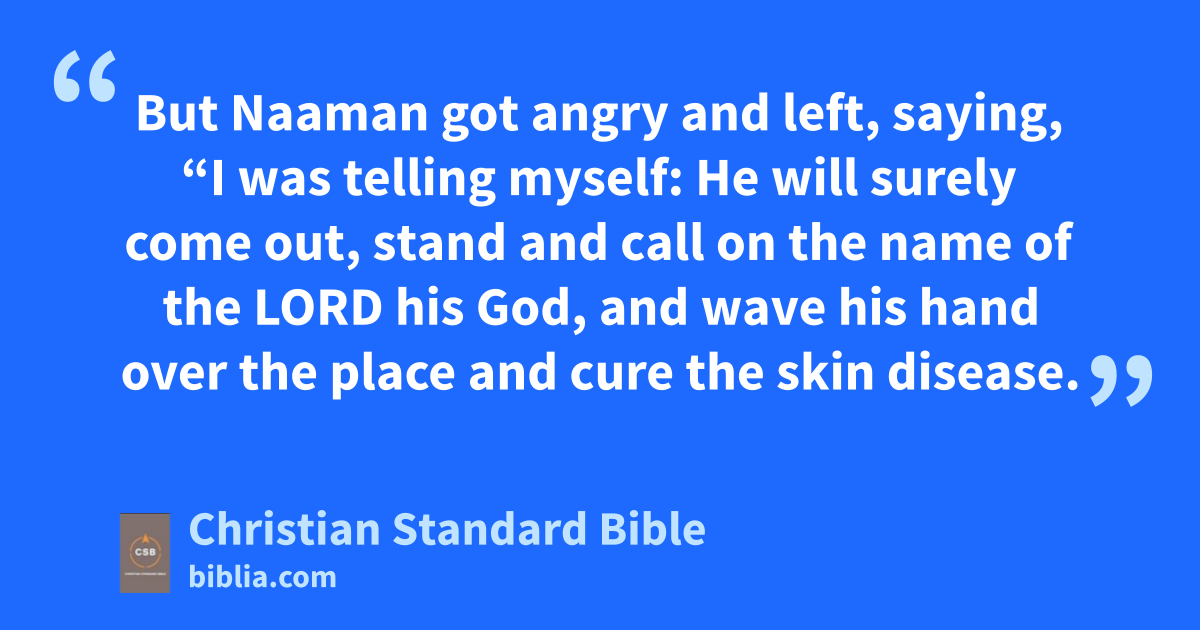 11 But Naaman got angry and left, saying, “I was telling myself: He will surely come out, stand and call on the name of the Lord his God, and wave his handx over the place and cure the skin disease. 12 Aren’t Abana and Pharpar, the rivers of Damascus, better than all the waters of Israel?y Couldn’t I wash in them and be clean?” So he turned and left in a rage.z