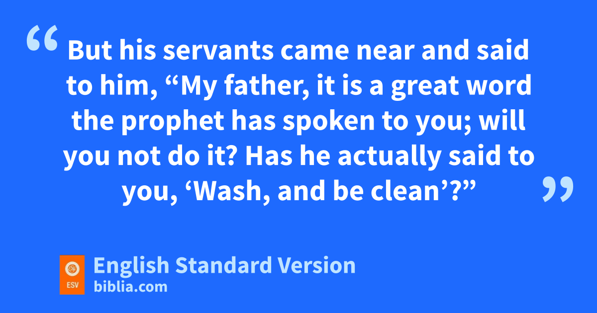 8 But when Elisha the tman of God heard that the king of Israel had torn his clothes, he sent to the king, saying, “Why have you torn your clothes? Let him come now to me, that he may know that there is a prophet in Israel.” 9 So Naaman came with his horses and chariots and stood at the door of Elisha’s house. 10 And Elisha sent a messenger to him, saying, u“Go and wash in the Jordan seven times, and your flesh shall be restored, and you shall be clean.” 11 But Naaman was angry and went away, saying, “Behold, I thought that he would surely come out to me and stand and call upon the name of the Lord his God, and wave his hand over the place and cure the leper. 12 Are not Abana3 and Pharpar, the rivers of vDamascus, better than all the waters of Israel? Could I not wash in them and be clean?” So he turned and went away in a rage. 13 But his servants came near and said to him, w“My father, it is a great word the prophet has spoken to you; will you not do it? Has he actually said to you, ‘Wash, and be clean’?” 14 So he went down and dipped himself seven times in the Jordan, according to the word of the man of God, xand his flesh was restored like the flesh of a little child, yand he was clean.