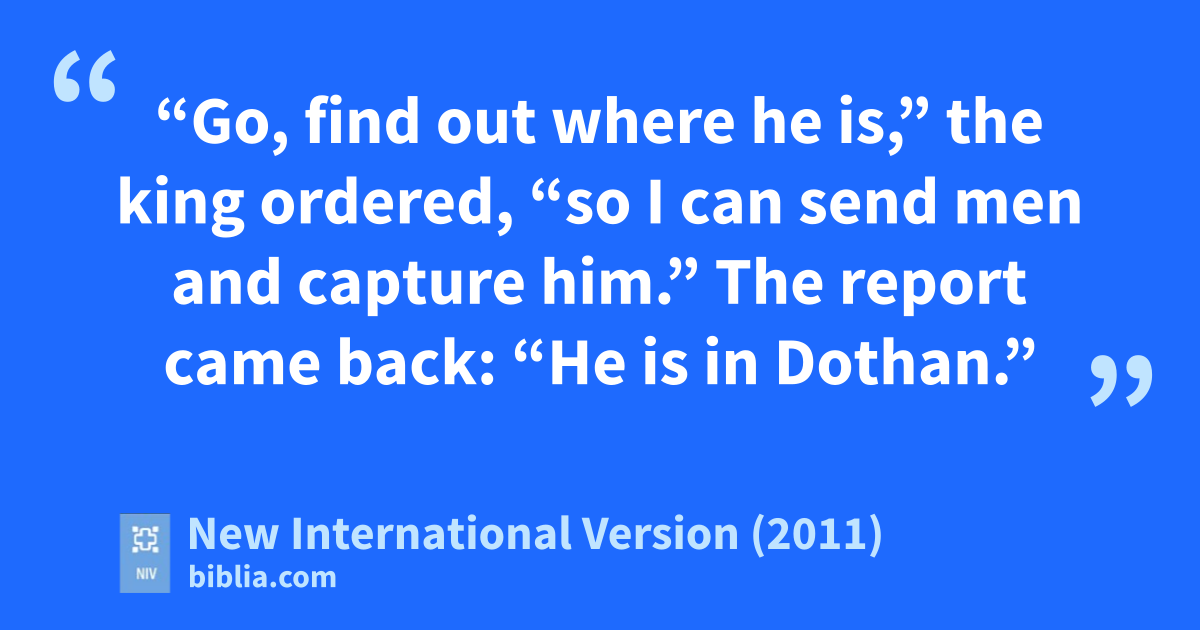 13 “Go, find out where he is,” the king ordered, “so I can send men and capture him.” The report came back: “He is in Dothan.”q 14 Then he sentr horses and chariots and a strong force there. They went by night and surrounded the city.