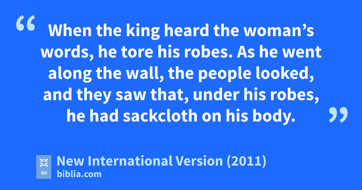 30 When the king heard the woman’s words, he toree his robes. As he went along the wall, the people looked, and they saw that, under his robes, he had sackclothf on his body. 31 He said, “May God deal with me, be it ever so severely, if the head of Elisha son of Shaphat remains on his shoulders today!”
