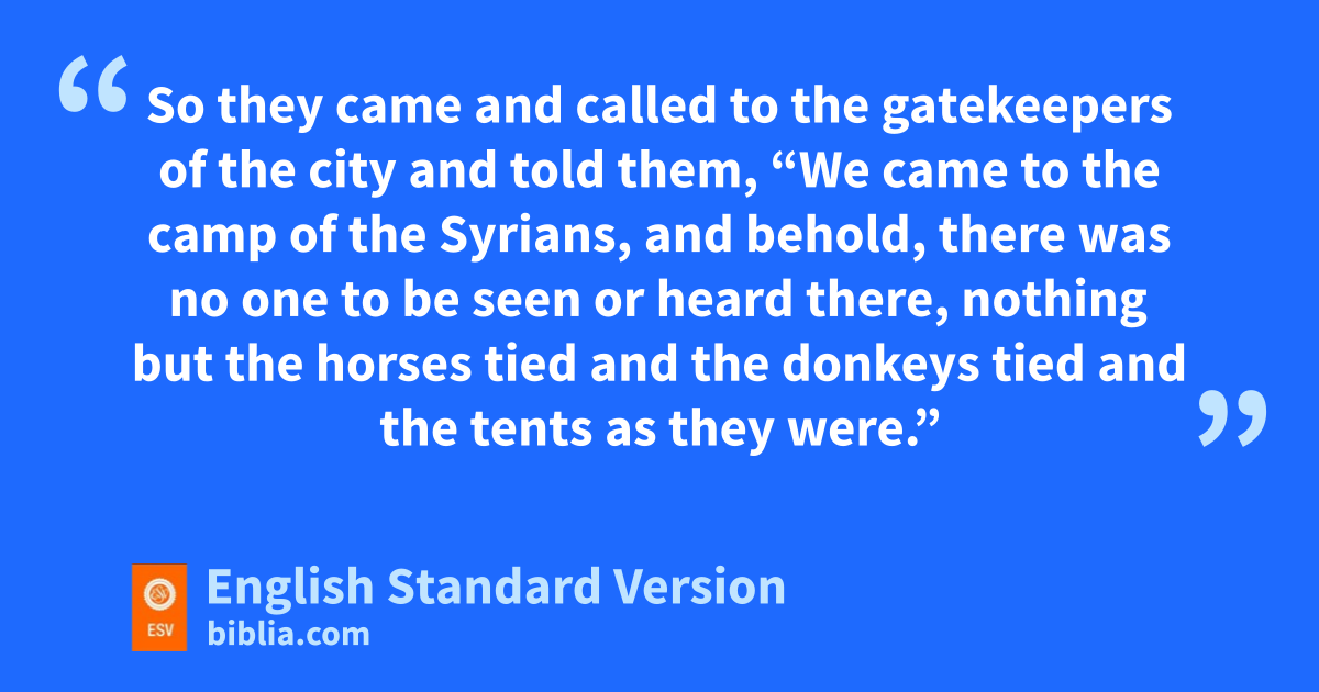 3 Now there were four men who were lepers3 iat the entrance to the gate. And they said to one another, “Why are we sitting here until we die? 4 If we say, ‘Let us enter the city,’ the famine is in the city, and we shall die there. And if we sit here, we die also. So now come, let us go over to the camp of the Syrians. If they spare our lives we shall live, and if they kill us we shall but die.” 5 So they arose at twilight to go to the camp of the Syrians. But when they came to the edge of the camp of the Syrians, behold, there was no one there. 6 For the Lord had made the army of the Syrians jhear the sound of chariots and of horses, the sound of a great army, so that they said to one another, “Behold, the king of Israel has hired against us kthe kings of the Hittites and the kings of Egypt to come against us.” 7 lSo they fled away in the twilight and abandoned their tents, their horses, and their donkeys, leaving the camp as it was, and fled for their lives. 8 And when these lepers came to the edge of the camp, they went into a tent and ate and drank, and they carried off silver and gold and clothing and went and hid them. Then they came back and entered another tent and carried off things from it and went and hid them.