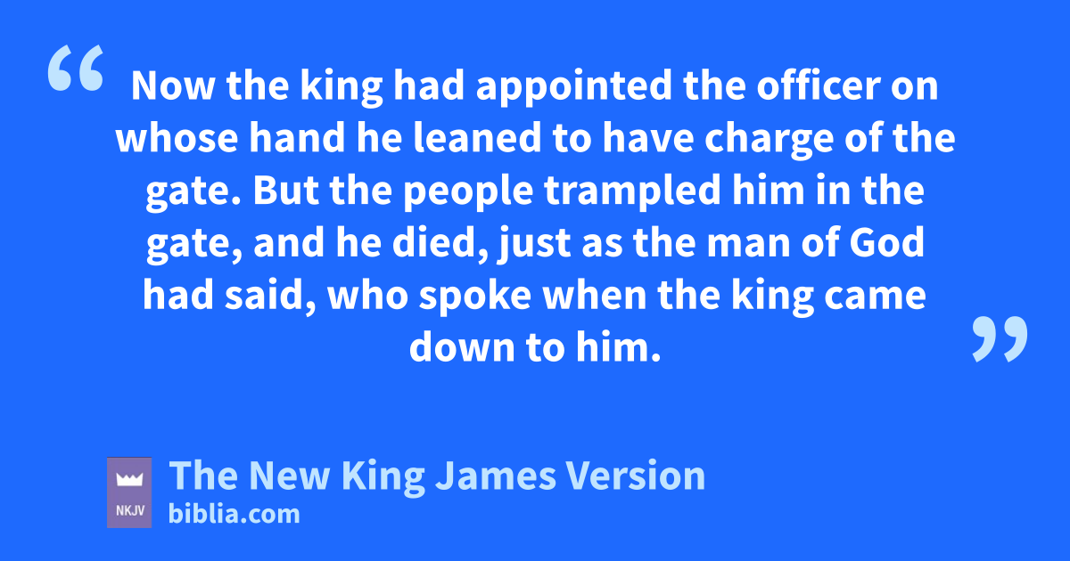 17 Now the king had appointed the officer on whose hand he leaned to have charge of the gate. But the people trampled him in the gate, and he died, just kas the man of God had said, who spoke when the king came down to him. 18 So it happened just as the man of God had spoken to the king, saying, l“Two seahs of barley for a shekel, and a seah of fine flour for a shekel, shall be sold tomorrow about this time in the gate of Samaria.”