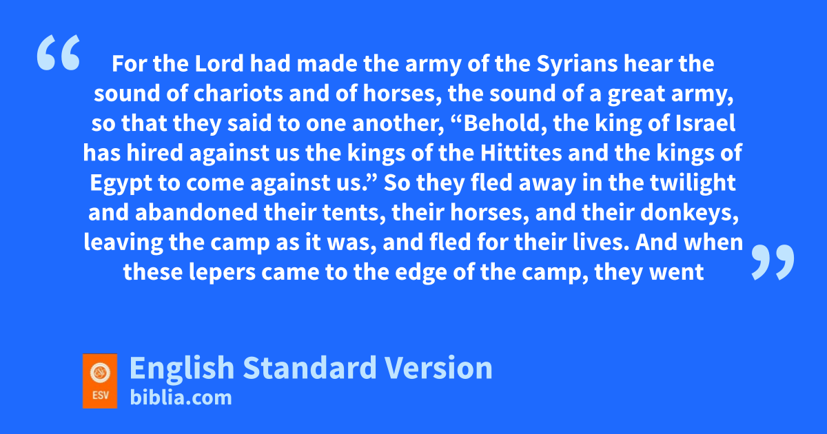 3 Now there were four men who were lepers3 iat the entrance to the gate. And they said to one another, “Why are we sitting here until we die? 4 If we say, ‘Let us enter the city,’ the famine is in the city, and we shall die there. And if we sit here, we die also. So now come, let us go over to the camp of the Syrians. If they spare our lives we shall live, and if they kill us we shall but die.” 5 So they arose at twilight to go to the camp of the Syrians. But when they came to the edge of the camp of the Syrians, behold, there was no one there. 6 For the Lord had made the army of the Syrians jhear the sound of chariots and of horses, the sound of a great army, so that they said to one another, “Behold, the king of Israel has hired against us kthe kings of the Hittites and the kings of Egypt to come against us.” 7 lSo they fled away in the twilight and abandoned their tents, their horses, and their donkeys, leaving the camp as it was, and fled for their lives. 8 And when these lepers came to the edge of the camp, they went into a tent and ate and drank, and they carried off silver and gold and clothing and went and hid them. Then they came back and entered another tent and carried off things from it and went and hid them.