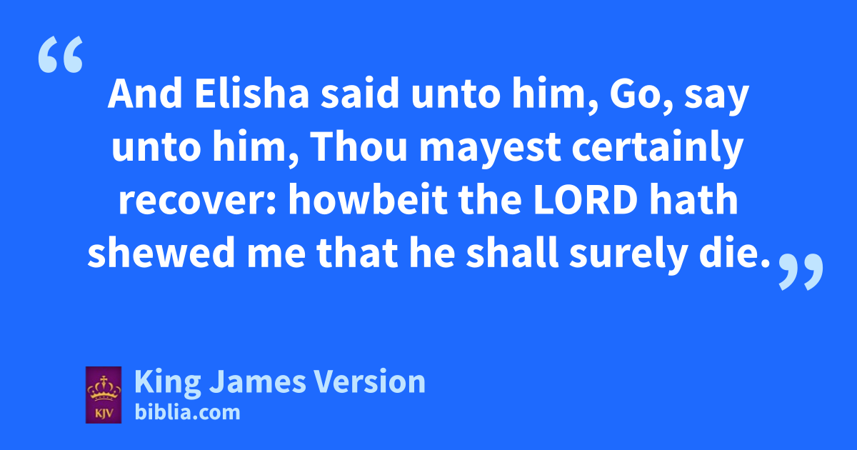 7 *And Elisha came to eDamascus; and fBen-hadad the king of Syria was sick; and it was told him, saying, The man of God is come hither. 8 And the king said unto gHazael, Take ha present in thine hand, and go, meet the man of God, and iinquire of the Lord by him, saying, Shall I recover of this disease? 9 So Hazael went to meet him, and took a present †with him, even of every good thing of Damascus, forty camels’ burden, and came and stood before him, and said, kThy son Ben-hadad king of Syria hath sent me to thee, saying, Shall I recover of this disease? 10 And Elisha said unto him, Go, say unto him, Thou mayest certainly recover: howbeit the Lord hath shewed me that lhe shall surely die. 11 And he settled his countenance †stedfastly, muntil he was ashamed: and the man of God wept. 12 And Hazael said, Why weepeth my lord? And he answered, Because I know nthe evil that thou wilt do unto the children of Israel: their strong holds wilt thou set on fire, and their young men wilt thou slay with the sword, and owilt dash their children, and prip up their women with child. 13 And Hazael said, But what, qis thy servant a dog, that he should do this great thing? And Elisha answered, rThe Lord hath shewed me that thou shalt be king over Syria. 14 So he departed from Elisha, and came to his master; who said to him, What said Elisha to thee? And he answered, He told me that sthou shouldest surely recover. 15 And it came to pass on the morrow, that he took a thick cloth, and dipped it in water, and spread it on his face, so that he died: and Hazael reigned in his stead.