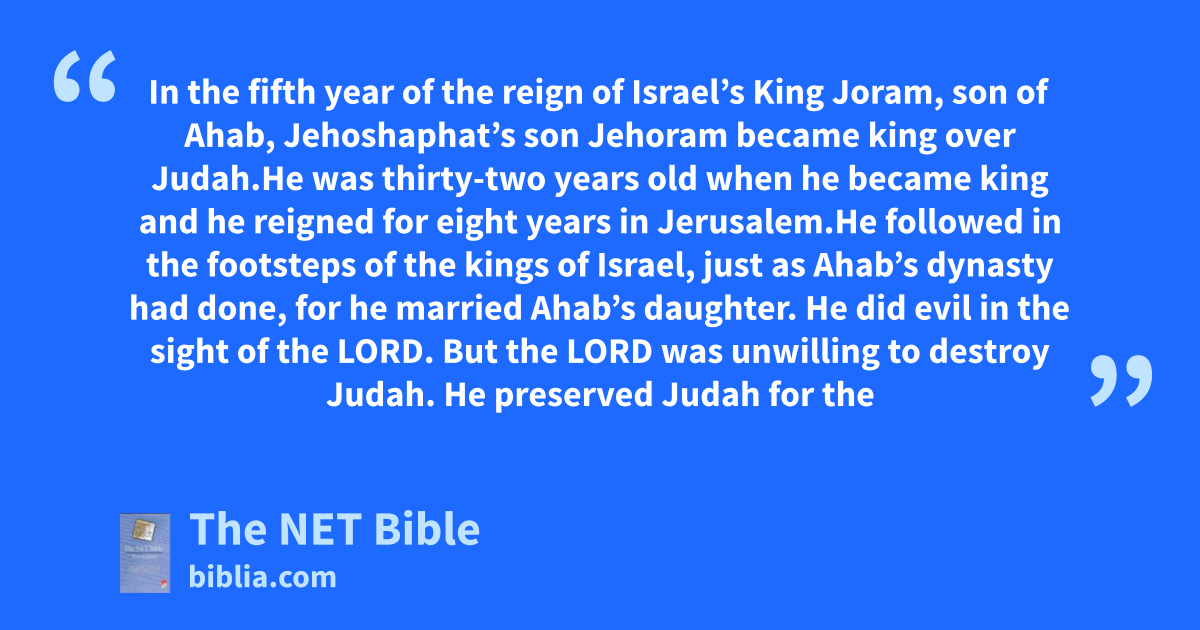 8:16 In the fifth year of the reign of Israel’s King Joram, son of Ahab, Jehoshaphat’s son Jehoram became king over Judah.28 8:17 He was thirty-two years old when he became king and he reigned for eight years in Jerusalem.29 8:18 He followed in the footsteps of the kings of Israel, just as Ahab’s dynasty had done, for he married Ahab’s daughter.30 He did evil in the sight of31 the Lord. 8:19 But the Lord was unwilling to destroy Judah. He preserved Judah for the sake of32 his servant David to whom he had promised a perpetual dynasty.33