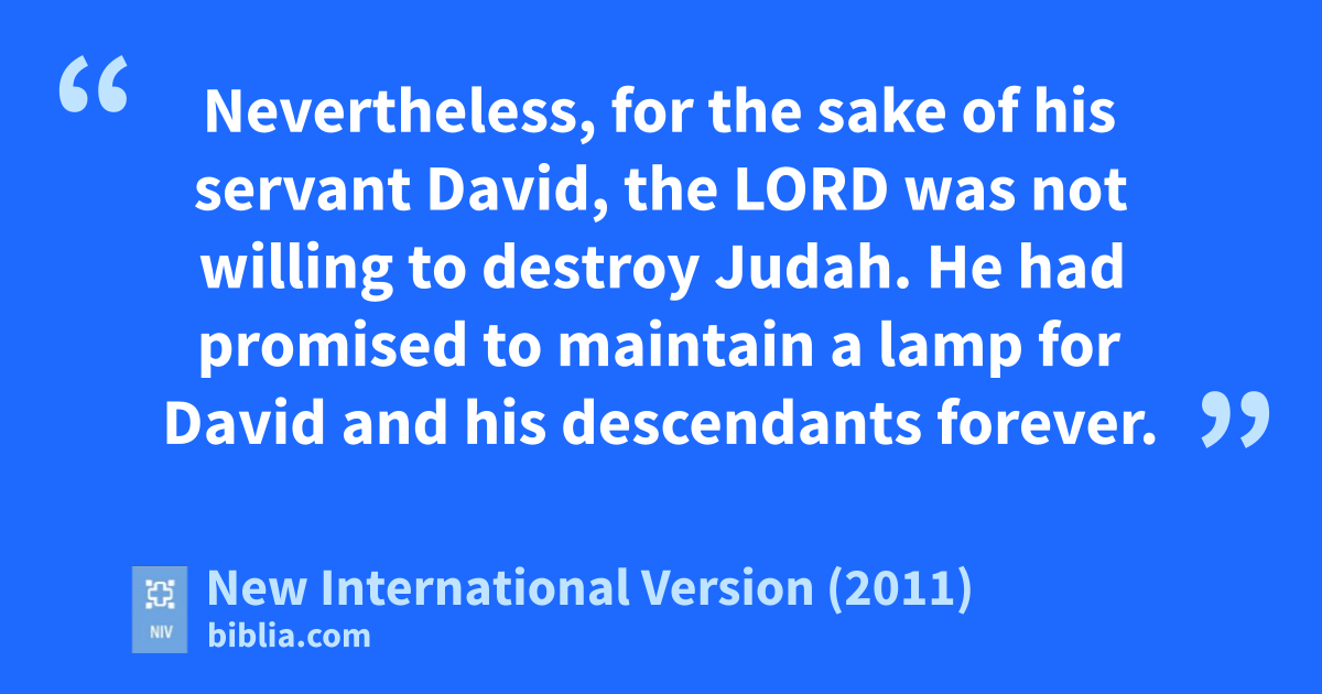 16 In the fifth year of Joramt son of Ahab king of Israel, when Jehoshaphat was king of Judah, Jehoramu son of Jehoshaphat began his reign as king of Judah. 17 He was thirty-two years old when he became king, and he reigned in Jerusalem eight years. 18 He followed the ways of the kings of Israel, as the house of Ahab had done, for he married a daughterv of Ahab. He did evil in the eyes of the Lord. 19 Nevertheless, for the sake of his servant David, the Lord was not willing to destroyw Judah. He had promised to maintain a lampx for David and his descendants forever.