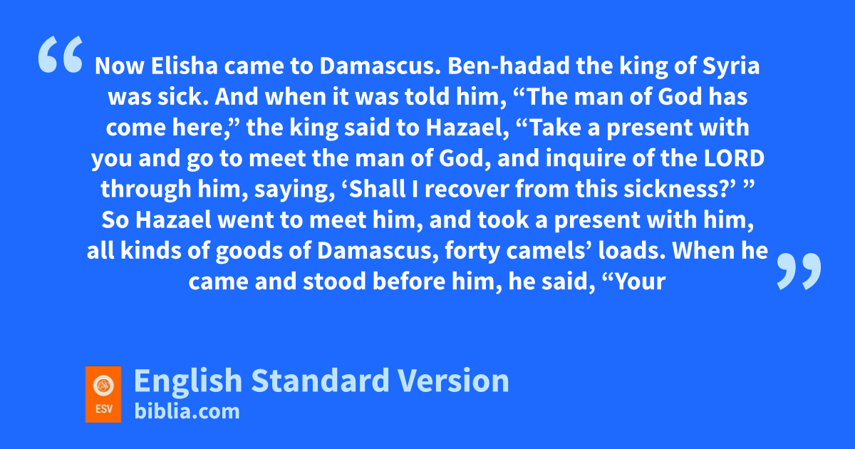 7 Now Elisha came to uDamascus. vBen-hadad the king of Syria was sick. And when it was told him, “The man of God has come here,” 8 the king said to wHazael, x“Take a present with you and go to meet the man of God, yand inquire of the Lord through him, saying, ‘Shall I recover from this sickness?’ ” 9 So Hazael went to meet him, and took a present with him, all kinds of goods of Damascus, forty camels’ loads. When he came and stood before him, he said, z“Your son Ben-hadad king of Syria has sent me to you, saying, ‘Shall I recover from this sickness?’ ” 10 And Elisha said to him, a“Go, say to him, ‘You shall certainly recover,’ but1 the Lord has shown me that bhe shall certainly die.” 11 And he fixed his gaze and stared at him, cuntil he was embarrassed. And the man of God wept. 12 And Hazael said, “Why does my lord weep?” He answered, “Because I know dthe evil that you will do to the people of Israel. You will set on fire their fortresses, and you will kill their young men with the sword eand dash in pieces their little ones and rip open their pregnant women.” 13 And Hazael said, “What is your servant, fwho is but a dog, that he should do this great thing?” Elisha answered, g“The Lord has shown me that you are to be king over Syria.” 14 Then he departed from Elisha and came to his master, who said to him, “What did Elisha say to you?” And he answered, “He told me hthat you would certainly recover.” 15 But the next day he took the bed cloth2 and dipped it in water and spread it over his face, till he died. And Hazael became king in his place.