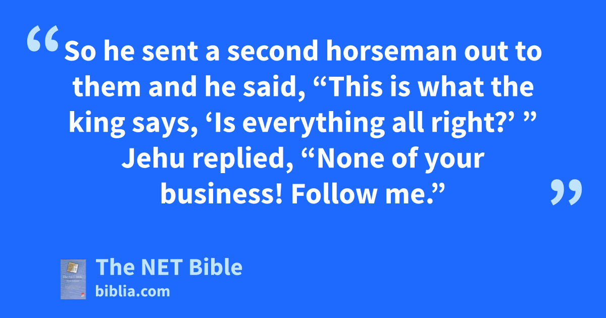 9:17 Now the watchman was standing on the tower in Jezreel and saw Jehu’s troops approaching.35 He said, “I see troops!”36 Jehoram ordered,37 “Send a rider out to meet them and have him ask, ‘Is everything all right?’ ”38 9:18 So the horseman39 went to meet him and said, “This is what the king says, ‘Is everything all right?’ ”40 Jehu replied, “None of your business!41 Follow me.” The watchman reported, “The messenger reached them, but hasn’t started back.” 9:19 So he sent a second horseman out to them42 and he said, “This is what the king says, ‘Is everything all right?’ ”43 Jehu replied, “None of your business! Follow me.” 9:20 The watchman reported, “He reached them, but hasn’t started back. The one who drives the lead chariot drives like Jehu son of Nimshi;44 he drives recklessly.” 9:21 Jehoram ordered, “Hitch up my chariot.”45 When his chariot had been hitched up,46 King Jehoram of Israel and King Ahaziah of Judah went out in their respective chariots47 to meet Jehu. They met up with him48 in the plot of land that had once belonged to Naboth of Jezreel.