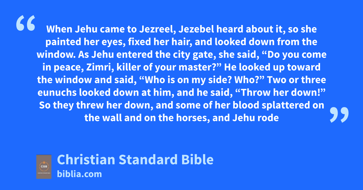32 He looked up toward the window and said, “Who is on my side? Who?” Two or three eunuchsc looked down at him, 33 and he said, “Throw her down!” So they threw her down, and some of her blood splattered on the wall and on the horses, and Jehu rode over her.d