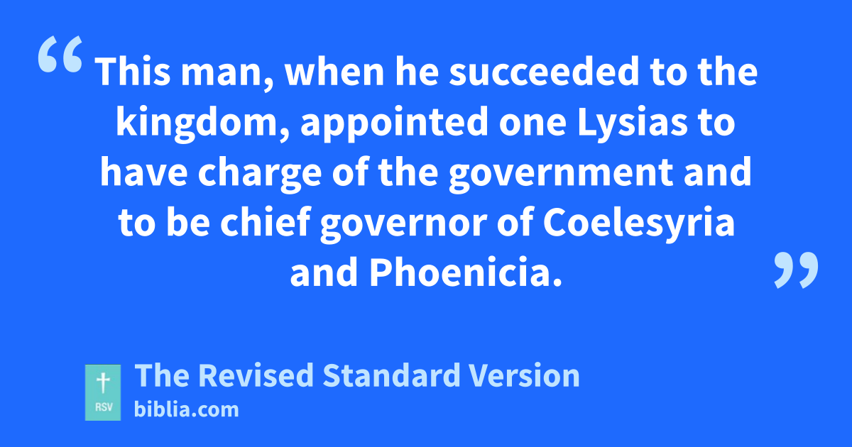 10 Now we will tell what took place under Antiochus Eupator, who was the son of that ungodly man, and will give a brief summary of the principal calamities of the wars. 11 This man, when he succeeded to the kingdom, appointed one Lysias to have charge of the government and to be chief governor of Coelesyria and Phoenicia. 12 Ptolemy, who was called Macron, took the lead in showing justice to the Jews because of the wrong that had been done to them, and attempted to maintain peaceful relations with them. 13 As a result he was accused before Eupator by the king’s friends. He heard himself called a traitor at every turn, because he had abandoned Cyprus, which Philometor had entrusted to him, and had gone over to Antiochus Epiphanes. Unable to command the respect due his office, he took poison and ended his life.