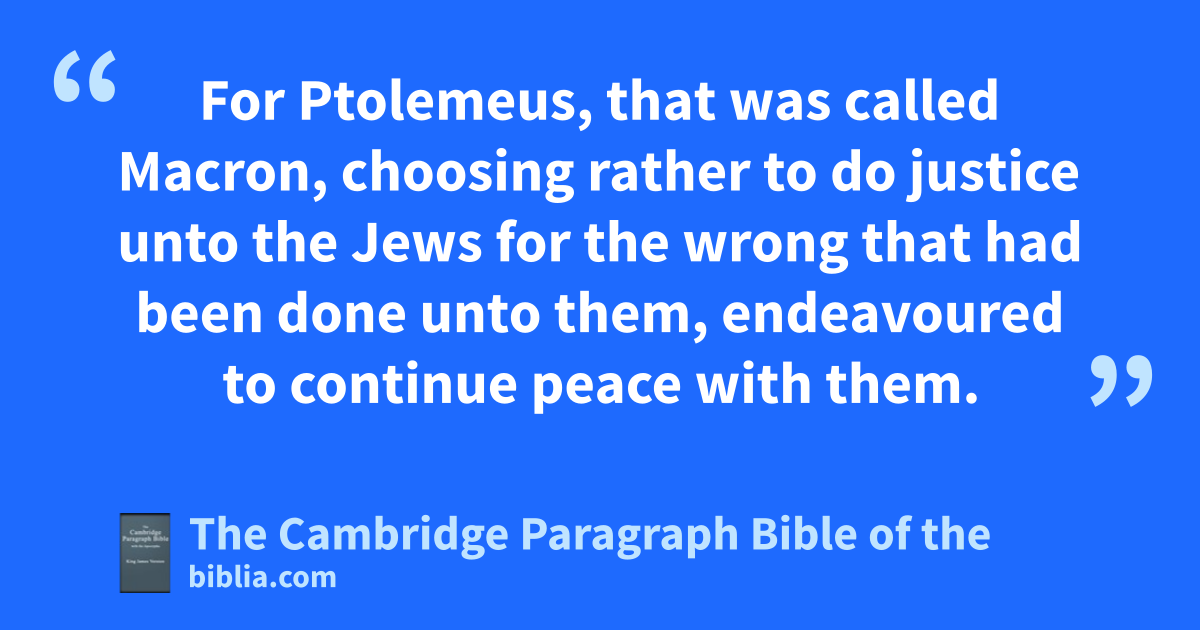 10 Now will we declare the acts of qAntiochus Eupator, who was the son of this wicked man, rgathering briefly the calamities of the wars. 11 So when he was come to the crown, he sset one tLysias over the affairs of his realm, and appointed him uchief governor of vCoelosyria and Phenice. 12 For wPtolemeus, that was called Macron, choosing rather to do justice unto the Jews for the wrong that had been done unto them, endeavoured to continue peace with them. 13 Whereupon being accused of the king’s friends before qEupator, and called traitor xat every word, because he had left yCyprus, that zPhilometor had committed unto him, and departed to pAntiochus Epiphanes, * and seeing that he was in no honourable place, he was so discouraged, that he poisoned himself and died.