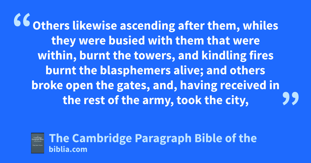 32 As for lTimotheus himself, he fled into a very strong hold, called uGazara, where vChereas was governor. 33 But wthey that were with Maccabeus laid siege against the fortress courageously four days. 34 And they that were within, trusting to the strength of the place, blasphemed exceedingly, and uttered xwicked words. 35 Nevertheless upon the fifth day early twenty young men wof Maccabeus’ company, inflamed with anger because of the blasphemies, assaulted the wall manly, and with a fierce courage killed all that they met withal. 36 Others likewise ascending after them, whiles they were busied with them that were within, yburnt the towers, and kindling fires burnt the blasphemers alive; and others broke open the gates, and, having received in the rest of the army, took the city, 37 and killed lzTimotheus, that was ahid in a certain pit, and vChereas his brother, with Apollophanes. 38 When this was done, they praised the Lord with bpsalms and thanksgiving, who had done so great things for Israel, and cgiven them the victory.