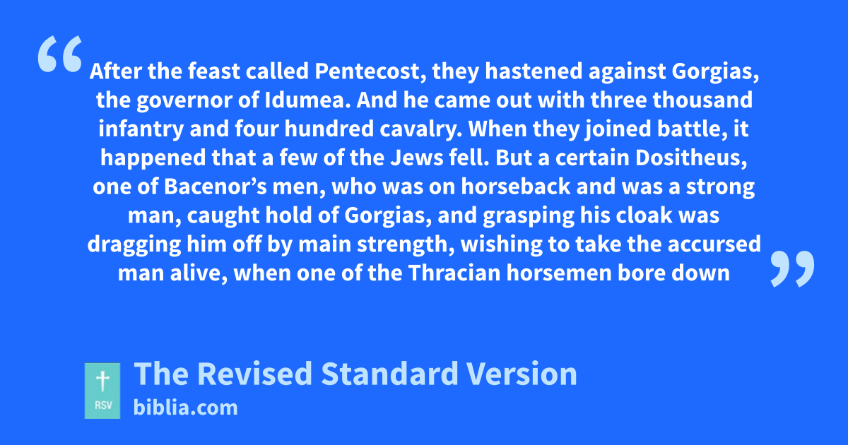 32 After the feast called Pentecost, they hastened against Gorgias, the governor of Idumea. 33 And he came out with three thousand infantry and four hundred cavalry. 34 When they joined battle, it happened that a few of the Jews fell. 35 But a certain Dositheus, one of Bacenor’s men, who was on horseback and was a strong man, caught hold of Gorgias, and grasping his cloak was dragging him off by main strength, wishing to take the accursed man alive, when one of the Thracian horsemen bore down upon him and cut off his arm; so Gorgias escaped and reached Marisa.