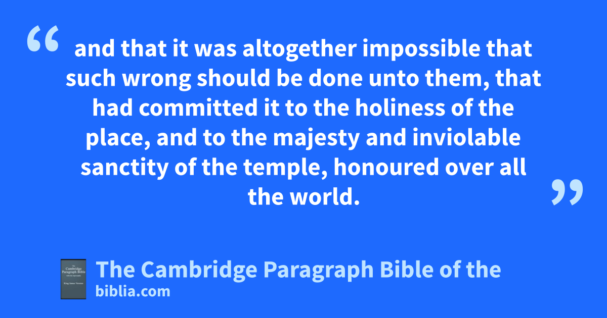 III. Now when athe holy city was inhabited with all peace, and the laws were kept very well, because of the godliness of bOnias the high priest, and his hatred of wickedness, 2 it came to pass that even the kings themselves did honour the place, and magnify the temple with their best cgifts; 3 insomuch that * dSeleucus king of eAsia of his own revenues bare all the costs belonging to the service of the sacrifices. 4 But one eeSimon of the tribe of Benjamin, who was made governor of the temple, ffell out with the high priest about disorder in the city. 5 And when he could not overcome Onias, he gat him to gApollonius the son of Thraseas, who then was governor of hCoelosyria and Phenice, 6 and told him that ithe treasury in Jerusalem was full of infinite sums of money, so that the multitude of their jriches, kwhich did not pertain to the account of the sacrifices, was innumerable, and that it was possible to bring all into the king’s hand. 7 Now when Apollonius came to the king, and had shewed him of the money whereof he was told, the king chose out Heliodorus his treasurer, and lsent him with a commandment to bring him the foresaid money. 8 So forthwith Heliodorus took his journey, munder a colour of visiting the cities of hCoelosyria and Phenice, but indeed to fulfil the king’s npurpose. 9 And when he was come to Jerusalem, and had been ocourteously received of the high priest of the city, he ptold him what intelligence was given of the money, and qdeclared wherefore he came, and asked if these things were so indeed. 10 Then the high priest told him that there was such rmoney laid up for the relief of swidows and fatherless children: 11 and that some of it belonged to Hircanus son of Tobias, a man of great dignity, and not as that wicked Simon had misinformed: the sum whereof in all was four hundred ttalents of silver, and two hundred of gold: 12 and that it was altogether impossible that such wrong should be done unto them, uthat had committed it to the holiness of the place, and to the majesty and inviolable sanctity of the temple, honoured over all the world. 13 But Heliodorus, vbecause of the king’s commandment given him, said, That in any wise it must be brought into the king’s treasury.