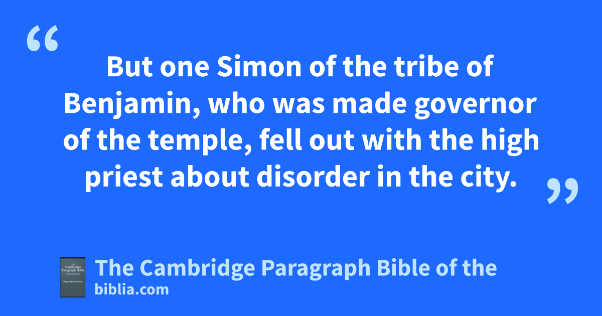 III. Now when athe holy city was inhabited with all peace, and the laws were kept very well, because of the godliness of bOnias the high priest, and his hatred of wickedness, 2 it came to pass that even the kings themselves did honour the place, and magnify the temple with their best cgifts; 3 insomuch that * dSeleucus king of eAsia of his own revenues bare all the costs belonging to the service of the sacrifices. 4 But one eeSimon of the tribe of Benjamin, who was made governor of the temple, ffell out with the high priest about disorder in the city. 5 And when he could not overcome Onias, he gat him to gApollonius the son of Thraseas, who then was governor of hCoelosyria and Phenice, 6 and told him that ithe treasury in Jerusalem was full of infinite sums of money, so that the multitude of their jriches, kwhich did not pertain to the account of the sacrifices, was innumerable, and that it was possible to bring all into the king’s hand. 7 Now when Apollonius came to the king, and had shewed him of the money whereof he was told, the king chose out Heliodorus his treasurer, and lsent him with a commandment to bring him the foresaid money. 8 So forthwith Heliodorus took his journey, munder a colour of visiting the cities of hCoelosyria and Phenice, but indeed to fulfil the king’s npurpose. 9 And when he was come to Jerusalem, and had been ocourteously received of the high priest of the city, he ptold him what intelligence was given of the money, and qdeclared wherefore he came, and asked if these things were so indeed. 10 Then the high priest told him that there was such rmoney laid up for the relief of swidows and fatherless children: 11 and that some of it belonged to Hircanus son of Tobias, a man of great dignity, and not as that wicked Simon had misinformed: the sum whereof in all was four hundred ttalents of silver, and two hundred of gold: 12 and that it was altogether impossible that such wrong should be done unto them, uthat had committed it to the holiness of the place, and to the majesty and inviolable sanctity of the temple, honoured over all the world. 13 But Heliodorus, vbecause of the king’s commandment given him, said, That in any wise it must be brought into the king’s treasury.