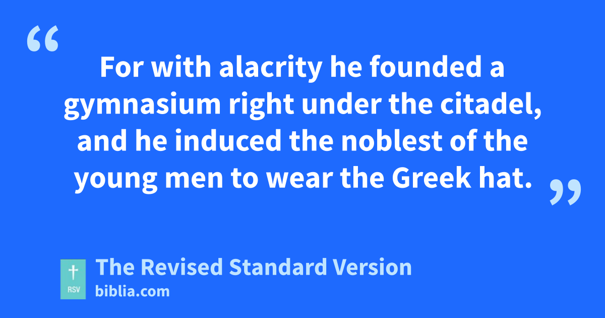 7 When Seleucus died and Antiochus who was called Epiphanes succeeded to the kingdom, Jason the brother of Onias obtained the high priesthood by corruption, 8 promising the king at an interview three hundred and sixty talents of silver and, from another source of revenue, eighty talents. 9 In addition to this he promised to pay one hundred and fifty more if permission were given to establish by his authority a gymnasium and a body of youth for it, and to enrol the men of Jerusalem as citizens of Antioch. 10 When the king assented and Jason came to office, he at once shifted his countrymen over to the Greek way of life. 11 He set aside the existing royal concessions to the Jews, secured through John the father of Eupolemus, who went on the mission to establish friendship and alliance with the Romans; and he destroyed the lawful ways of living and introduced new customs contrary to the law. 12 For with alacrity he founded a gymnasium right under the citadel, and he induced the noblest of the young men to wear the Greek hat. 13 There was such an extreme of Hellenization and increase in the adoption of foreign ways because of the surpassing wickedness of Jason, who was ungodly and no high priest, 14 that the priests were no longer intent upon their service at the altar. Despising the sanctuary and neglecting the sacrifices, they hastened to take part in the unlawful proceedings in the wrestling arena after the call to the discus, 15 disdaining the honors prized by their fathers and putting the highest value upon Greek forms of prestige. 16 For this reason heavy disaster overtook them, and those whose ways of living they admired and wished to imitate completely became their enemies and punished them. 17 For it is no light thing to show irreverence to the divine laws—a fact which later events will make clear.