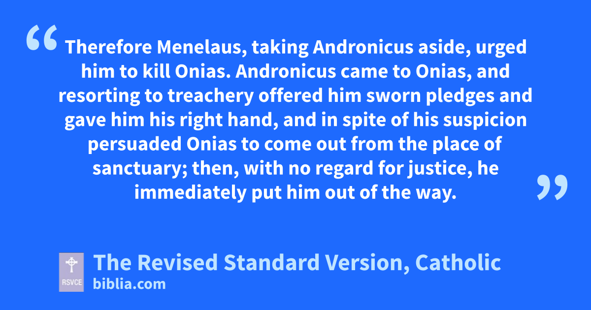 30 While such was the state of affairs, it happened that the people of Tarsus and of Mallus revolted because their cities had been given as a present to Antiochis, the king’s concubine. 31 So the king went hastily to settle the trouble, leaving Andronicus, a man of high rank, to act as his deputy. 32 But Menelaus, thinking he had obtained a suitable opportunity, stole some of the gold vessels of the temple and gave them to Andronicus; other vessels, as it happened, he had sold to Tyre and the neighboring cities. 33 When Onias became fully aware of these acts he publicly exposed them, having first withdrawn to a place of sanctuary at Daphne near Antioch. 34 Therefore Menelaus, taking Andronicus aside, urged him to kill Onias. Andronicusp came to Onias, and resorting to treachery offered him sworn pledges and gave him his right hand, and in spite of his suspicion persuaded Oniasq to come out from the place of sanctuary; then, with no regard for justice, he immediately put him out of the way. 35 For this reason not only Jews, but many also of other nations, were grieved and displeased at the unjust murder of the man. 36 When the king returned from the region of Cilicia, the Jews in the cityr appealed to him with regard to the unreasonable murder of Onias, and the Greeks shared their hatred of the crime. 37 Therefore Antiochus was grieved at heart and filled with pity, and wept because of the moderation and good conduct of the deceased; 38 and inflamed with anger, he immediately stripped off the purple robe from Andronicus, tore off his garments, and led him about the whole city to that very place where he had committed the outrage against Onias, and there he dispatched the bloodthirsty fellow. The Lord thus repaid him with the punishment he deserved.