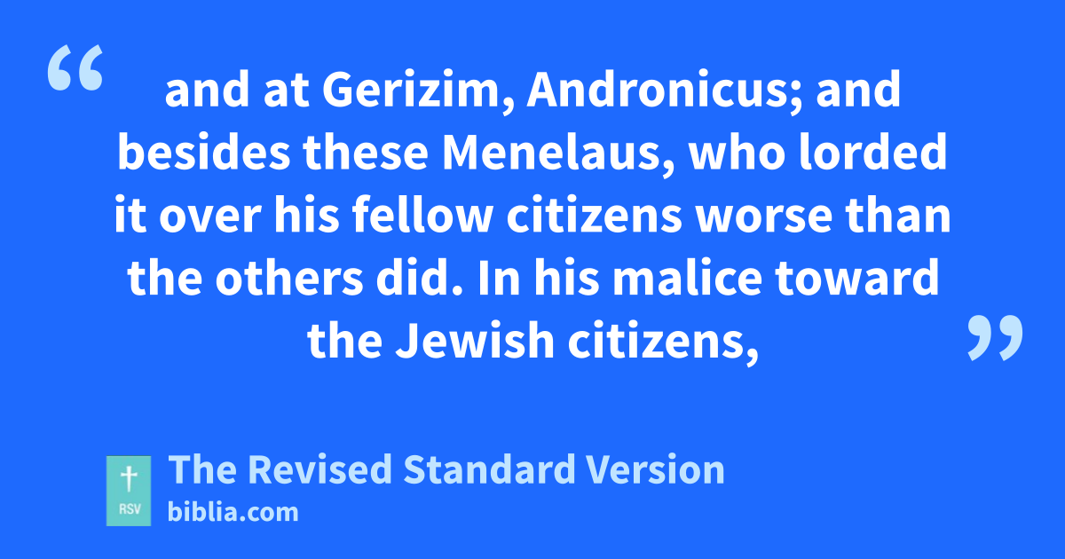 21 So Antiochus carried off eighteen hundred talents from the temple, and hurried away to Antioch, thinking in his arrogance that he could sail on the land and walk on the sea, because his mind was elated. 22 And he left governors to afflict the people: at Jerusalem, Philip, by birth a Phrygian and in character more barbarous than the man who appointed him; 23 and at Gerizim, Andronicus; and besides these Menelaus, who lorded it over his fellow citizens worse than the others did. In his malice toward the Jewish citizens, 24 Antiochus sent Apollonius, the captain of the Mysians, with an army of twenty-two thousand, and commanded him to slay all the grown men and to sell the women and boys as slaves. 25 When this man arrived in Jerusalem, he pretended to be peaceably disposed and waited until the holy sabbath day; then, finding the Jews not at work, he ordered his men to parade under arms. 26 He put to the sword all those who came out to see them, then rushed into the city with his armed men and killed great numbers of people.