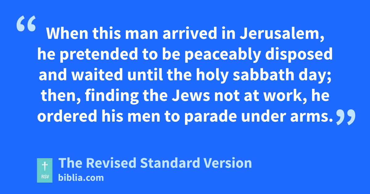 21 So Antiochus carried off eighteen hundred talents from the temple, and hurried away to Antioch, thinking in his arrogance that he could sail on the land and walk on the sea, because his mind was elated. 22 And he left governors to afflict the people: at Jerusalem, Philip, by birth a Phrygian and in character more barbarous than the man who appointed him; 23 and at Gerizim, Andronicus; and besides these Menelaus, who lorded it over his fellow citizens worse than the others did. In his malice toward the Jewish citizens, 24 Antiochus sent Apollonius, the captain of the Mysians, with an army of twenty-two thousand, and commanded him to slay all the grown men and to sell the women and boys as slaves. 25 When this man arrived in Jerusalem, he pretended to be peaceably disposed and waited until the holy sabbath day; then, finding the Jews not at work, he ordered his men to parade under arms. 26 He put to the sword all those who came out to see them, then rushed into the city with his armed men and killed great numbers of people.