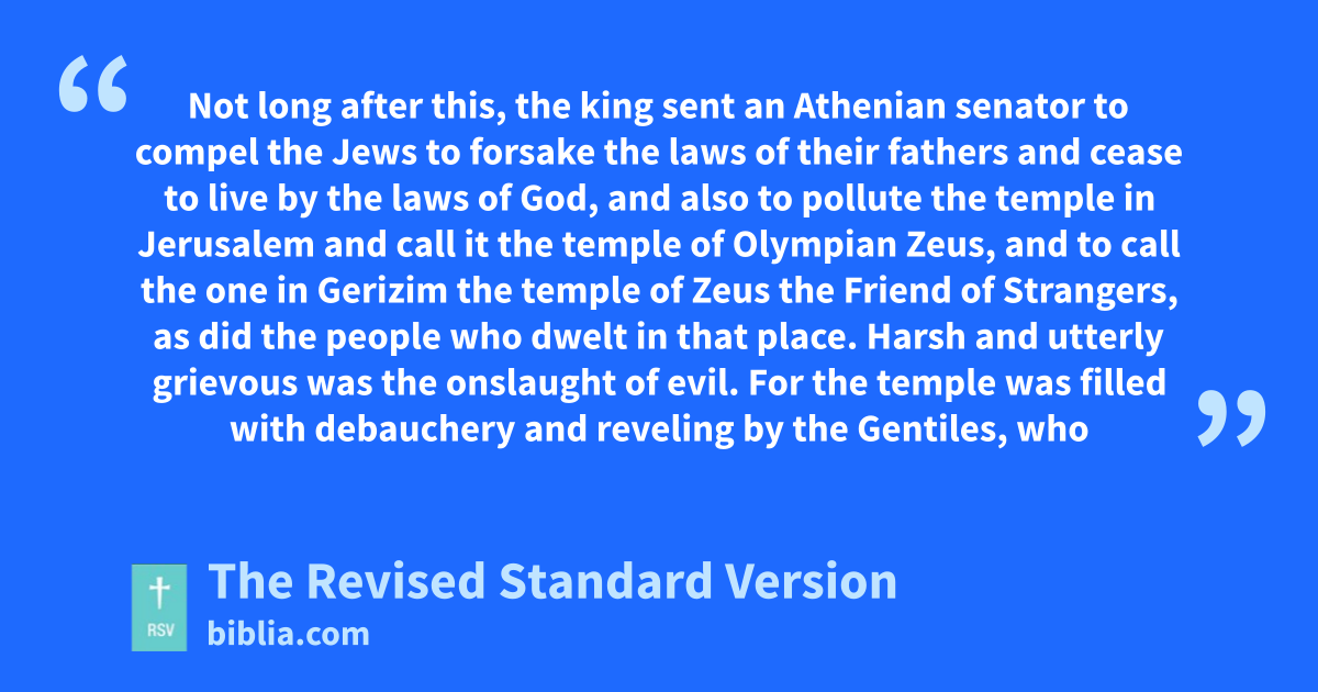 1 Not long after this, the king sent an Athenian senator to compel the Jews to forsake the laws of their fathers and cease to live by the laws of God, 2 and also to pollute the temple in Jerusalem and call it the temple of Olympian Zeus, and to call the one in Gerizim the temple of Zeus the Friend of Strangers, as did the people who dwelt in that place.