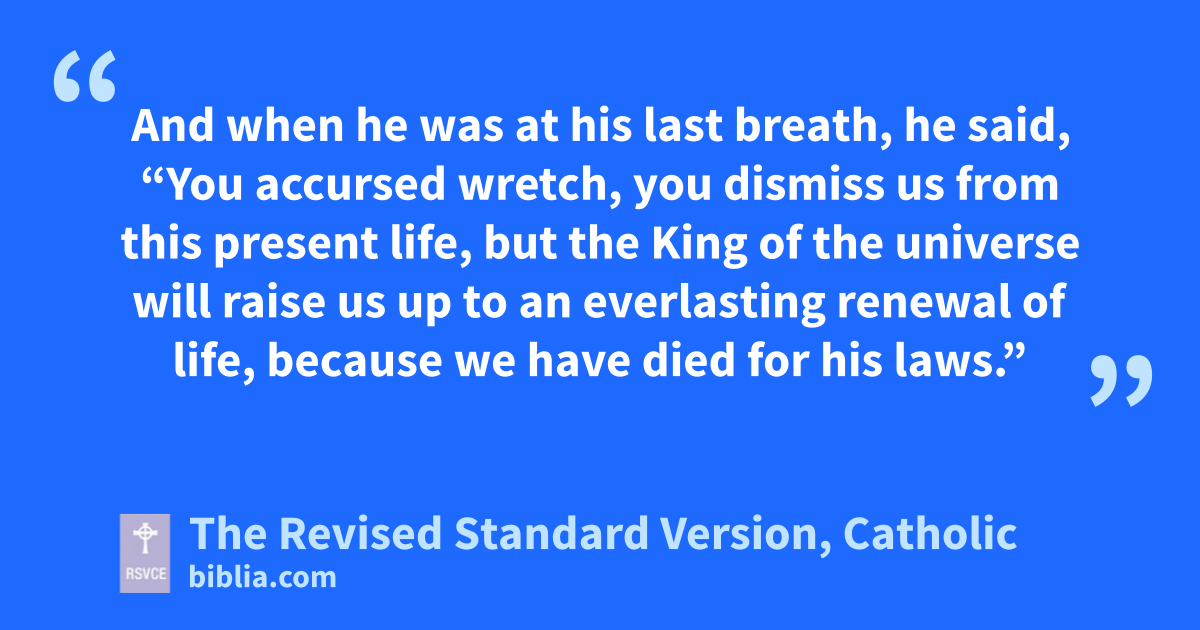 7 After the first brother had died in this way, they brought forward the second for their sport. They tore off the skin of his head with the hair, and asked him, “Will you eat rather than have your body punished limb by limb?” 8 He replied in the language of his fathers, and said to them, “No.” Therefore he in turn underwent tortures as the first brother had done. 9 And when he was at his last breath, he said, “You accursed wretch, you dismiss us from this present life, but the King of the universe will raise us up to an everlasting renewal of life, because we have died for his laws.”