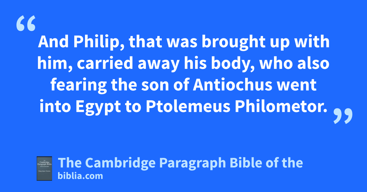 28 Thus the murderer and blasphemer having suffered most grievously, as he entreated other men, oso died he a miserable death in a strange country in the mountains. 29 And pPhilip, qthat was brought up with him, carried away his body, who also fearing the son of Antiochus went into Egypt to rPtolemeus Philometor.