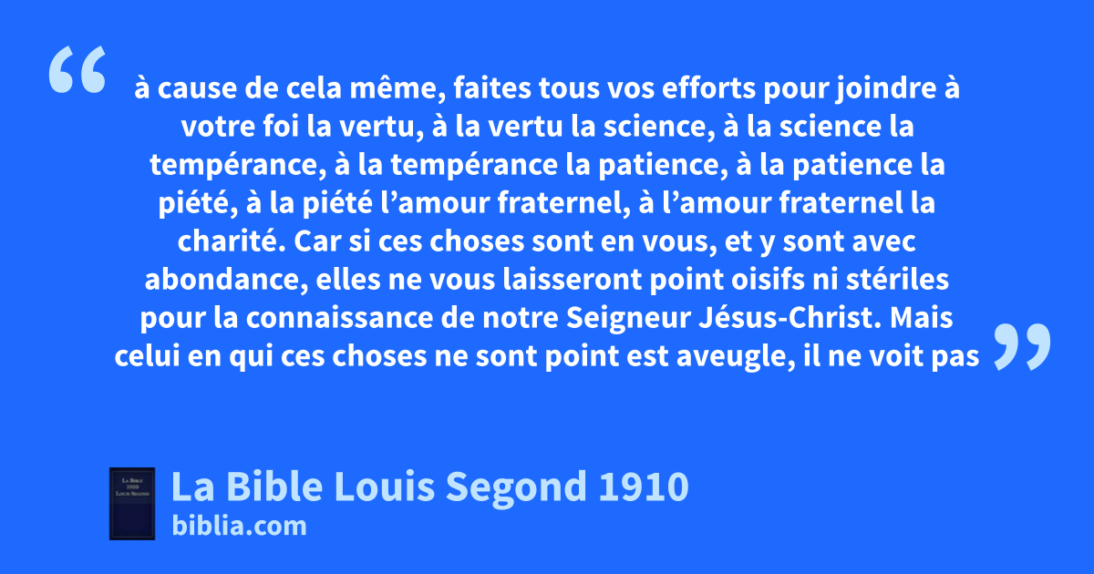 3Comme sa divine puissance nous a donné tout ce qui contribue à la vie et à la piété, au moyen de la connaissance de celui qui nous a appelés par sa propre gloire et par sa vertu, 4lesquelles nous assurent de sa part les plus grandes et les plus précieuses promesses, dafin que par elles vous deveniez participants de la nature divine, en fuyant la corruption qui existe dans le monde par la convoitise, 5à cause de cela même, faites tous vos efforts pour joindre à votre foi la vertu, à la vertu la science, 6à la science la tempérance, à la tempérance la patience, à la patience la piété, 7à la piété l’amour fraternel, à l’amour fraternel la charité. 8Car si ces choses sont en vous, et y sont avec abondance, elles ne vous laisseront point oisifs ni estériles pour la connaissance de notre Seigneur Jésus-Christ. 9Mais celui en qui ces choses ne sont point est aveugle, fil ne voit pas de loin, et il a mis en oubli la purification de ses anciens péchés. 10C’est pourquoi, frères, appliquez-vous d’autant plus à affermir votre vocation et votre élection; car, en faisant cela, vous ne broncherez jamais. 11C’est ainsi, en effet, que l’entrée dans le royaume éternel de notre Seigneur et Sauveur Jésus-Christ vous sera pleinement accordée.