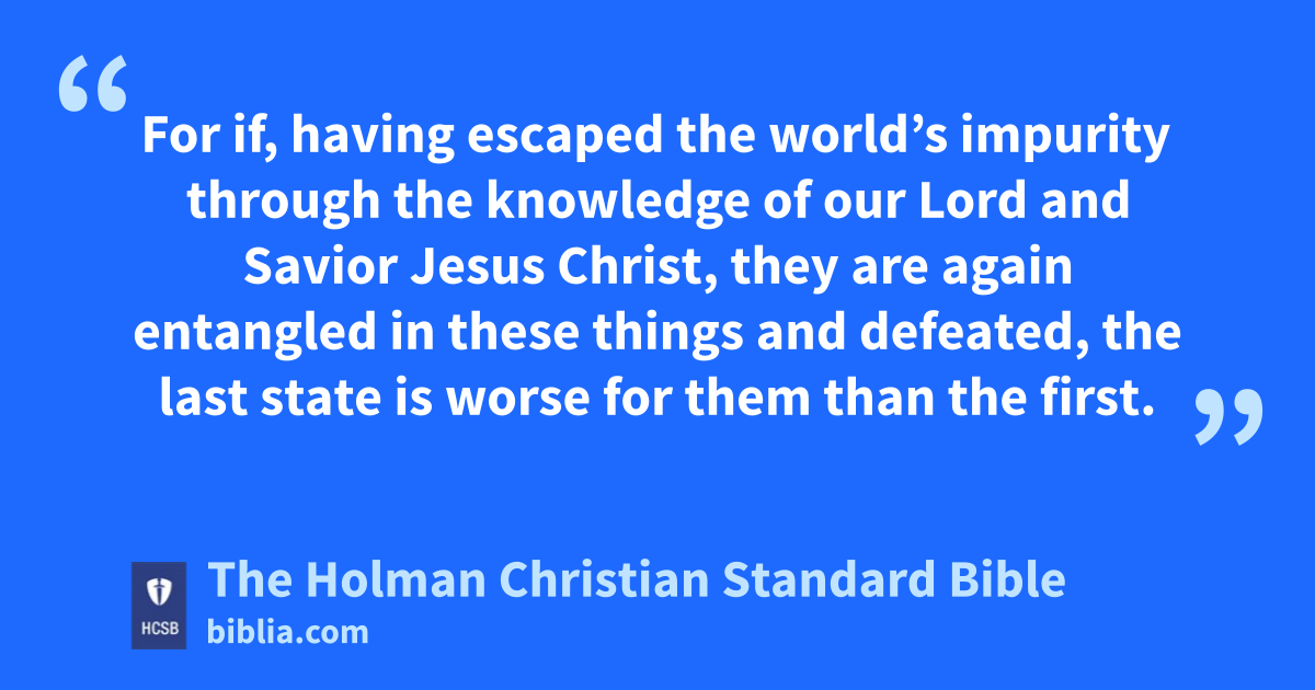 17 These people are springs without water, mists driven by a whirlwind. The gloom of darkness has been reserved for them. r 18 For by uttering boastful, empty words, s they seduce, with fleshly desires and debauchery, people who have barely escaped t from those who live in error. 19 They promise them freedom, but they themselves are * slaves of corruption, since people are enslaved to whatever defeats them. u 20 For if, having escaped the world’s impurity through the knowledge of our Lord and Savior Jesus Christ, v they are again entangled in these things and defeated, the last state is worse for them than the first. w 21 For it would have been better for them not to have known the way of righteousness x than, after knowing it, to turn back from the holy command y delivered z to them. a 22 It has happened to them according to the true proverb: A dog returns to its own vomit, b c and, “a sow, after washing itself, wallows in the mud.”
