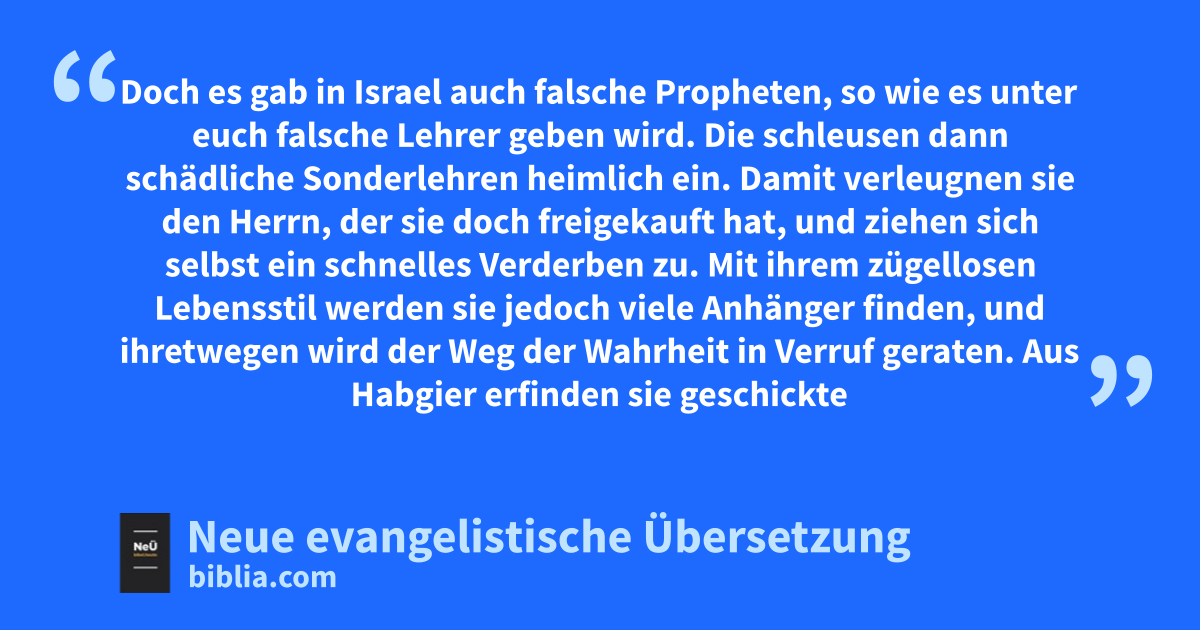 2 1 Doch es gab in Israel auch falsche Propheten, so wie es unter euch falsche Lehrer geben wird. Die schleusen dann schädliche Sonderlehren heimlich ein. Damit verleugnen sie den Herrn1, der sie doch freigekauft hat, und ziehen sich selbst ein schnelles Verderben zu. 2 Mit ihrem zügellosen Lebensstil werden sie jedoch viele Anhänger finden, und ihretwegen wird der Weg der Wahrheit in Verruf geraten. 3 Aus Habgier erfinden sie geschickte Lügen, um euch damit zu betrügen. Doch das Urteil über sie ist längst gefällt, sie werden ihrem Verderben nicht entgehen.