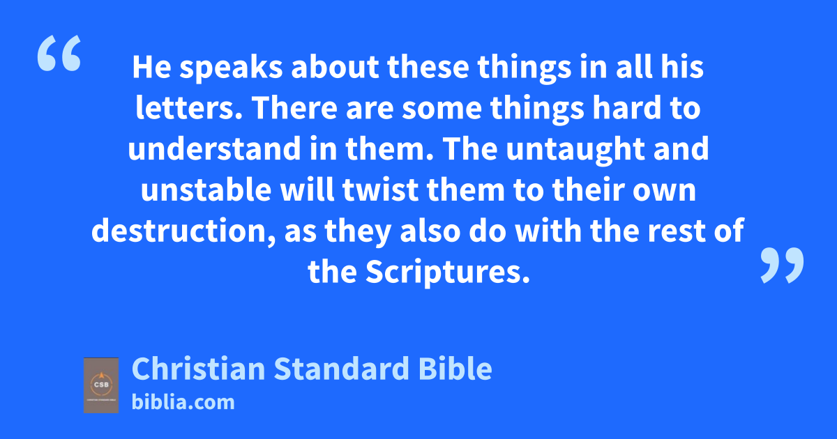 14 Therefore, dear friends, while you wait for these things, make every effort to be found without spot or blemish in his sight, at peace.c 15 Also, regard the patience of our Lord as salvation, just as our dear brother Paul has written to you according to the wisdom given to him.d 16 He speaks about these things in all his letters. There are some things hard to understand in them. The untaught and unstable will twist them to their own destruction,e as they also do with the rest of the Scriptures.