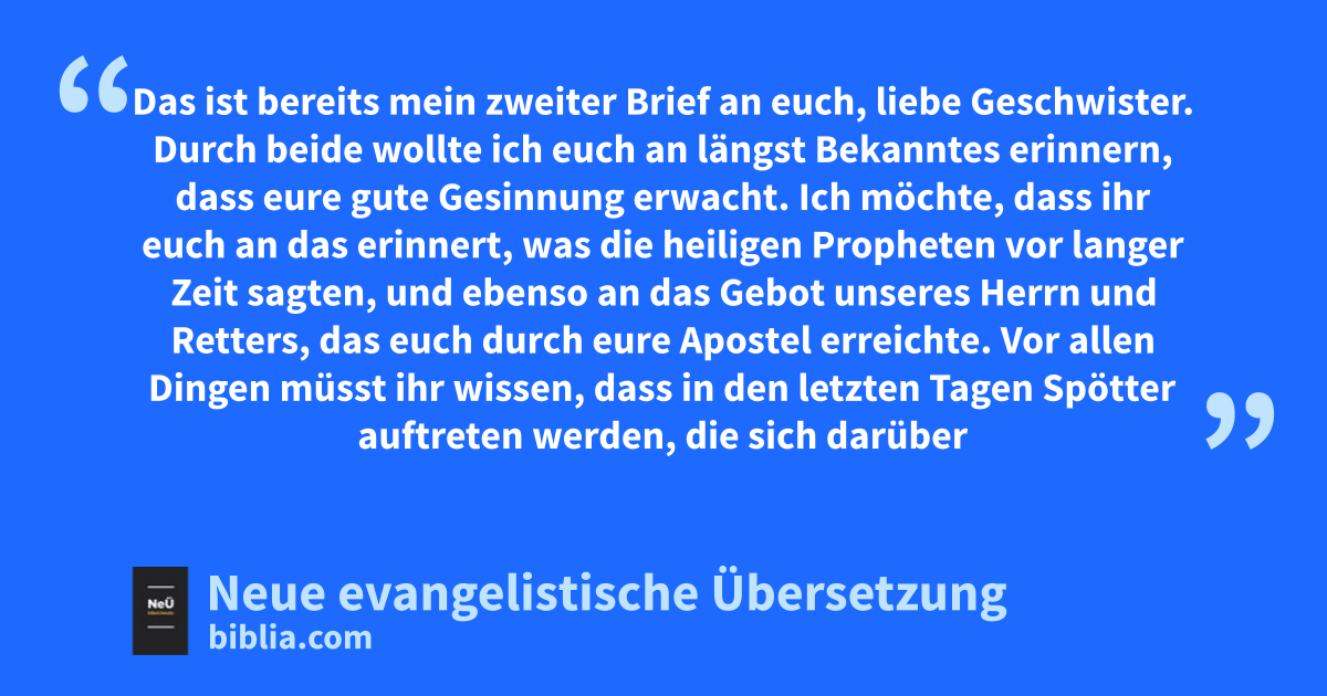 3 1 Das ist bereits mein zweiter Brief an euch, liebe Geschwister. Durch beide wollte ich euch an längst Bekanntes erinnern, dass eure gute Gesinnung erwacht. 2 Ich möchte, dass ihr euch an das erinnert, was die heiligen Propheten vor langer Zeit sagten, und ebenso an das Gebot unseres Herrn und Retters, das euch durch eure Apostel erreichte. 3 Vor allen Dingen müsst ihr wissen, dass in den letzten Tagen Spötter auftreten werden, die sich darüber lustig machen und ihre eigenen Begierden ausleben. 4 Sie werden sagen: „Er hat doch versprochen wiederzukommen! Wo bleibt er denn? Inzwischen sind unsere Väter gestorben, aber alles ist immer noch so, wie es seit der Schöpfung von Anfang an war.“ 5 Wer das behauptet, will nicht wahrhaben, dass es die Himmel schon längst gab und die Erde aus dem Wasser hervorgetreten und mit Wasser umgeben war. Gott hatte sie durch sein Wort geschaffen. 6 Dennoch wurde die Welt damals ‹bei der großen Flut auf Gottes Wort hin› durch Wasser überschwemmt und vernichtet. 7 Durch dasselbe Wort werden nun auch die jetzigen Himmel und die jetzige Erde für das Feuer aufgespart. Sie werden bewahrt bis zum Tag des Gerichts, an dem die Gottlosen zugrunde gehen.