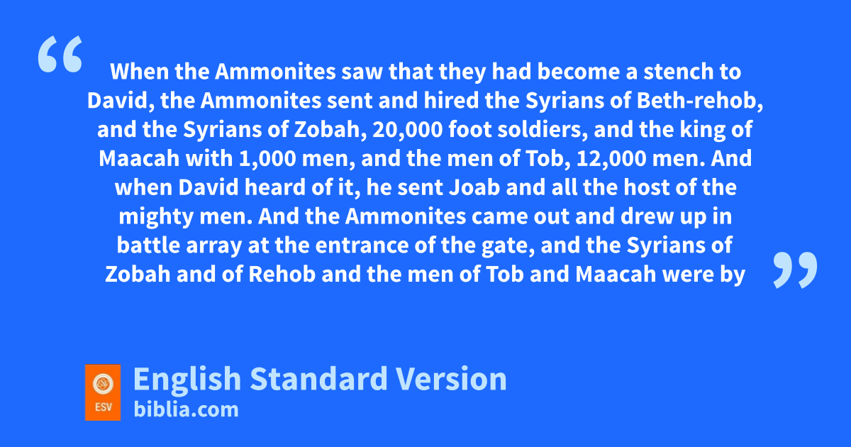 6 When the Ammonites saw that they had become a stench to David, the Ammonites sent and hired the Syrians of vBeth-rehob, and wthe Syrians of Zobah, 20,000 foot soldiers, and the king of xMaacah with 1,000 men, and the men of yTob, 12,000 men. 7 And when David heard of it, he sent Joab and all the host of zthe mighty men. 8 And the Ammonites came out and drew up in battle array at the entrance of the gate, and wthe Syrians of Zobah and of Rehob and ythe men of Tob and Maacah were by themselves in the open country.