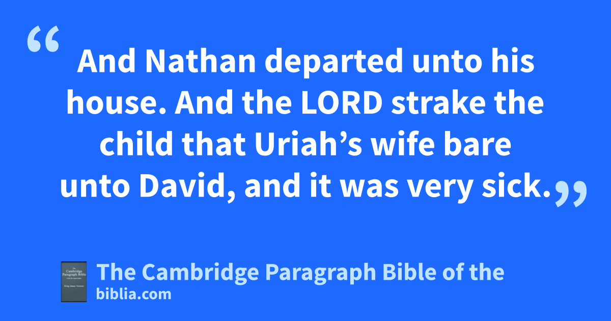 15 And Nathan departed unto his house. And the Lord strake the child that Uriah’s wife bare unto David, and it was very sick. 16 David therefore besought God for the child; and David * fasted, and went in, and play all night upon the earth. 17 And the elders of his house arose, and went to him, to raise him up from the earth: but he would not, neither did he eat bread with them. 18 And it came to pass on the seventh day, that the child died. And the servants of David feared to tell him that the child was dead: for they said, Behold, while the child was yet alive, we spake unto him, and he would not hearken unto our voice: how will he then * vex himself, if we tell him that the child is dead? 19 But when David saw that his servants whispered, David perceived that the child was dead: therefore David said unto his servants, Is the child dead? And they said, He is dead. 20 Then David arose from the earth, and qwashed, and anointed himself, and changed his apparel, and came into the house of the Lord, and rworshipped: then he came to his own house; and when he required, they set bread before him, and he did eat. 21 Then said his servants unto him, What thing is this that thou hast done? thou didst fast and weep for the child, while it was alive; but when the child was dead, thou didst rise and eat bread. 22 And he said, While the child was yet alive, I fasted and wept: sfor I said, Who can tell whether God will be gracious to me, that the child may live? 23 But now he is dead, wherefore should I fast? can I bring him back again? I shall go to him, but the shall not return to me. 24 * And David comforted Bathsheba his wife, and went in unto her, and lay with her: and ushe bare a son, and xhe called his name Solomon: and the Lord loved him. 25 And he sent by the hand of Nathan the prophet; and he called his name * Jedidiah, because of the Lord.
