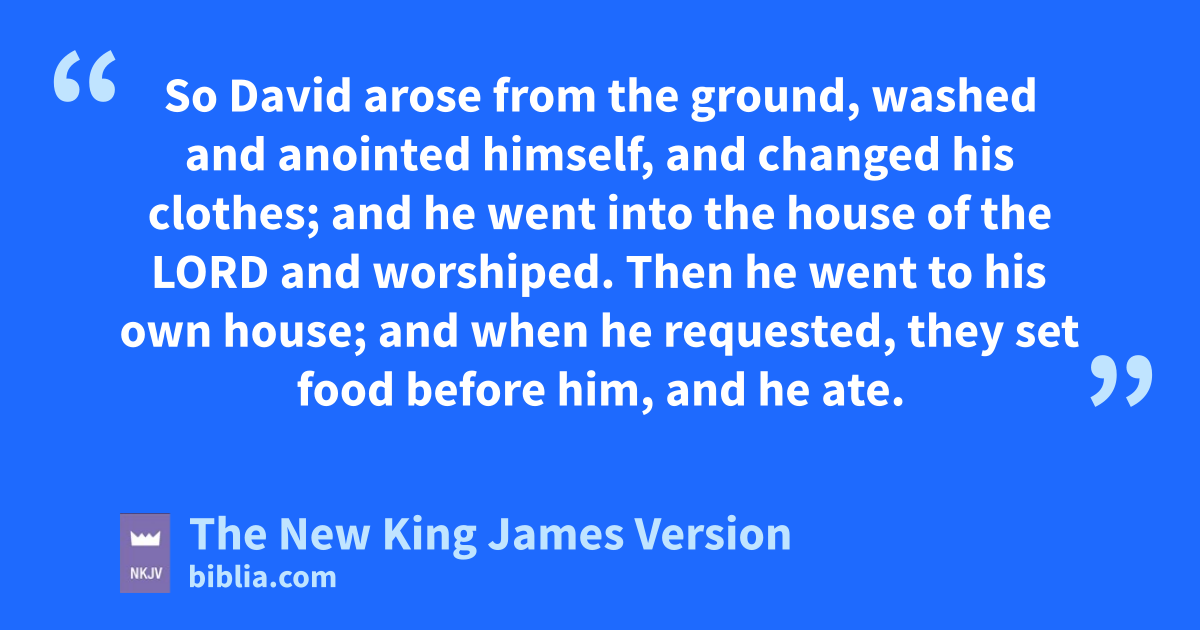 20 So David arose from the ground, washed and qanointed himself, and changed his clothes; and he went into the house of the Lord and rworshiped. Then he went to his own house; and when he requested, they set food before him, and he ate. 21 Then his servants said to him, “What is this that you have done? You fasted and wept for the child while he was alive, but when the child died, you arose and ate food.”