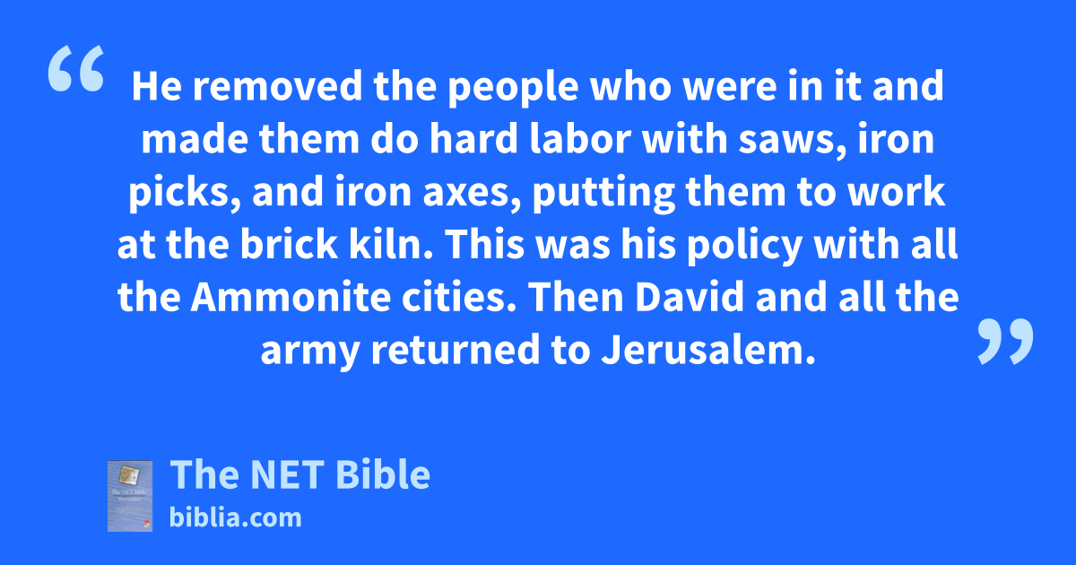 12:29 So David assembled all the army and went to Rabbah and fought against it and captured it. 12:30 He took the crown of their king44 from his head—it was gold, weighed about seventy-five pounds,45 and held a precious stone—and it was placed on David’s head. He also took from the city a great deal of plunder. 12:31 He removed46 the people who were in it and made them do hard labor with saws, iron picks, and iron axes, putting them to work at the brick kiln. This was his policy47 with all the Ammonite cities. Then David and all the army returned to Jerusalem.48
