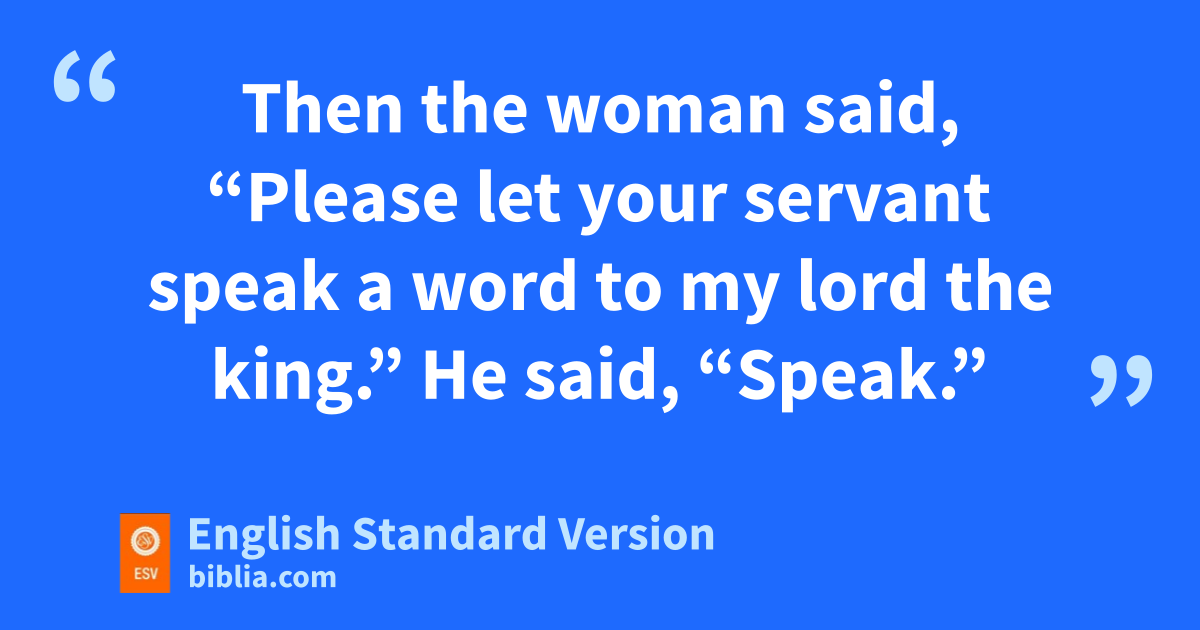 12 Then the woman said, “Please let your servant speak a word to my lord the king.” He said, “Speak.” 13 And the woman said, “Why then have you planned such a thing against hthe people of God? For in giving this decision the king convicts himself, inasmuch as the king does not bring ihis banished one home again. 14 We must all die; we are jlike water spilled on the ground, which cannot be gathered up again. But God will not take away life, and he devises means kso that the banished one will not remain an outcast. 15 Now I have come to say this to my lord the king because the people have made me afraid, and your servant thought, ‘I will speak to the king; it may be that the king will perform the request of his servant. 16 For the king will hear and deliver his servant from the hand of the man who would destroy me and my son together from lthe heritage of God.’ 17 And your servant thought, ‘The word of my lord the king will set me at rest,’ for my lord the king is mlike the angel of God to discern good and evil. The Lord your God be with you!”