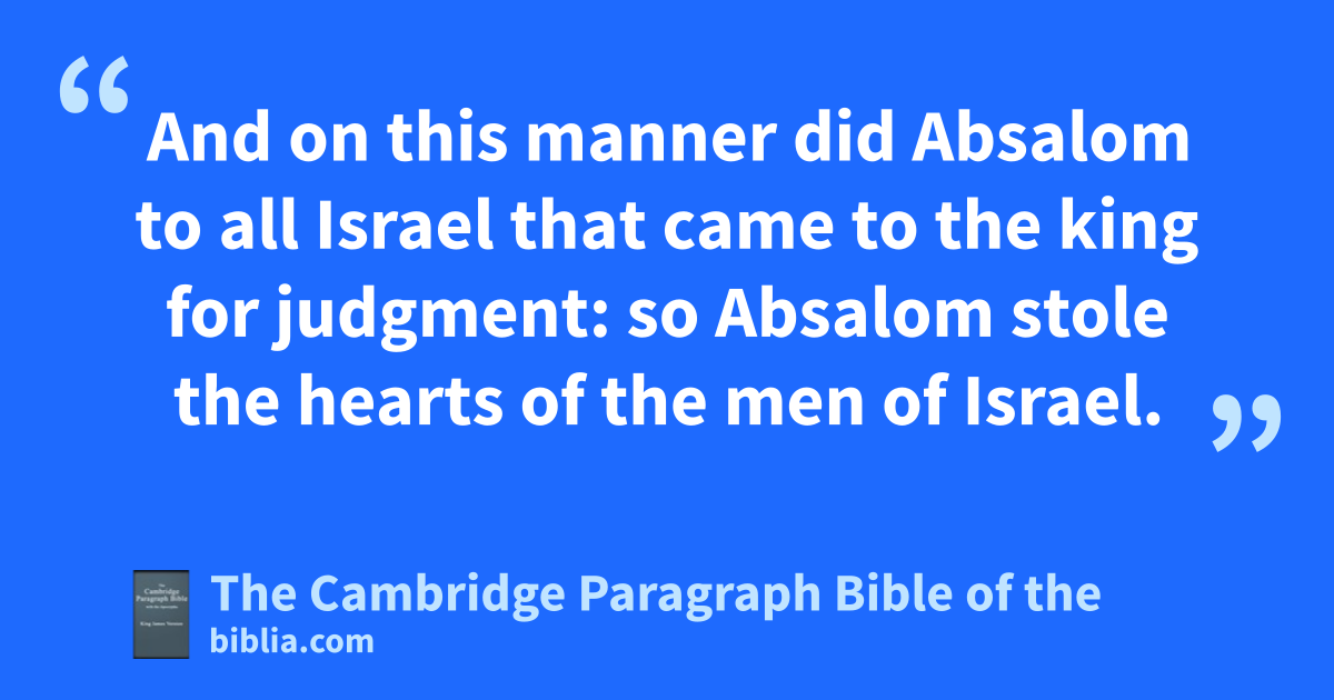XV. And it came to pass after this, that Absalom aprepared him chariots and horses, and fifty men to run before him. 2 And Absalom rose up early, and stood beside the way of the gate: and it was so, that when any man that had a controversy * came to the king for judgment, then Absalom called unto him, and said, Of what city art thou? And he said, Thy servant is of one of the tribes of Israel. 3 And Absalom said unto him, See, thy matters are good and right; but * there is no man deputed of the king to hear thee. 4 Absalom said moreover, bOh that I were made judge in the land, that every man which hath any suit or cause might come unto me, and I would do him justice. 5 And it was so, that when any man came nigh to him to do him obeisance, he put forth his hand, and took him, and kissed him. 6 And on this manner did Absalom to all Israel that came to the king for judgment: so Absalom stole the hearts of the men of Israel. 7 * And it came to pass cafter forty years, that Absalom said unto the king, I pray thee, let me go and pay my vow, which I have vowed unto the Lord, in Hebron. 8 For thy servant dvowed a vow ewhile I abode at Geshur in Syria, saying, If the Lord shall bring me again indeed to Jerusalem, then I will serve the Lord. 9 And the king said unto him, fGo in peace. So he arose, and went to Hebron. 10 But Absalom sent spies throughout all the tribes of Israel, saying, As soon as ye hear the sound of the trumpet, then ye shall say, Absalom reigneth in Hebron. 11 And with Absalom went two hundred men out of Jerusalem, that were gcalled; and they went hin their simplicity, and they knew not any thing. 12 And Absalom sent for iAhithophel the Gilonite, jDavid’s counseller, from his city, even from kGiloh, while he offered sacrifices. And the conspiracy was strong; for the people lincreased mcontinually with Absalom.