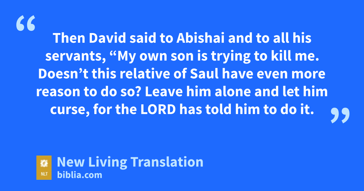11 Then David said to Abishai and to all his servants, “My own son is trying to kill me. Doesn’t this relative of Saul* have even more reason to do so? Leave him alone and let him curse, for the Lord has told him to do it. 12 And perhaps the Lord will see that I am being wronged* and will bless me because of these curses today.” 13 So David and his men continued down the road, and Shimei kept pace with them on a nearby hillside, cursing and throwing stones and dirt at David.