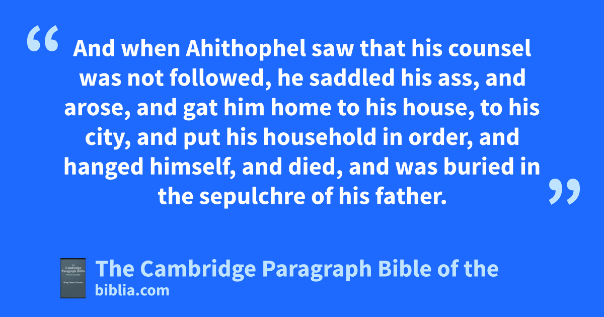 XVII. Moreover Ahithophel said unto Absalom, Let me now choose out twelve thousand men, and I will arise and pursue after David this night: 2 and I will come upon him while he is aweary and weak handed, and will make him afraid: and all the people that are with him shall flee; and I will smite the king only: 3 and I will bring back all the people unto thee: the man whom thou seekest is as if all returned: so all the people shall be in peace. 4 And the saying * pleased Absalom well, and all the elders of Israel. 5 Then said Absalom, Call now bHushai the Archite also, and let us hear likewise * what he saith. 6 And when Hushai was come to Absalom, Absalom spake unto him, saying, Ahithophel hath spoken after this manner: shall we do after his * saying? if not; speak thou. 7 And Hushai said unto Absalom, The counsel that Ahithophel hath * given is not good at this time. 8 For, (said Hushai,) thou knowest thy father and his men, that they be mighty men, and they be * chafed in their minds, as ca bear robbed of her whelps in the field: and thy father is a man of war, and will not lodge with the people. 9 Behold, he is hid now in some pit, or in some other place: and it will come to pass, when some of them be * overthrown at the first, that whosoever heareth it will say, There is a slaughter among the people that follow Absalom. 10 And he also that is valiant, whose heart is as the heart of a lion, shall utterly dmelt: for all Israel knoweth that thy father is a mighty man, and they which be with him are valiant men. 11 Therefore I counsel that all Israel be generally gathered unto thee, efrom Dan even to Beer-sheba, fas the sand that is by the sea for multitude; and * that thou go to battle in thine own person. 12 So shall we come upon him in some place where he shall be found, and we will light upon him as the dew falleth on the ground: and of him and of all the men that are with him there shall not be left so much as one. 13 Moreover, if he be gotten into a city, then shall all Israel bring ropes to that city, and we will draw it into the river, until there be not one gsmall stone found there. 14 And Absalom and all the men of Israel said, The counsel of Hushai the Archite is better than the counsel of Ahithophel. For the Lord had * appointed hto defeat the good counsel of Ahithophel, to the intent that the Lord might bring evil upon Absalom.