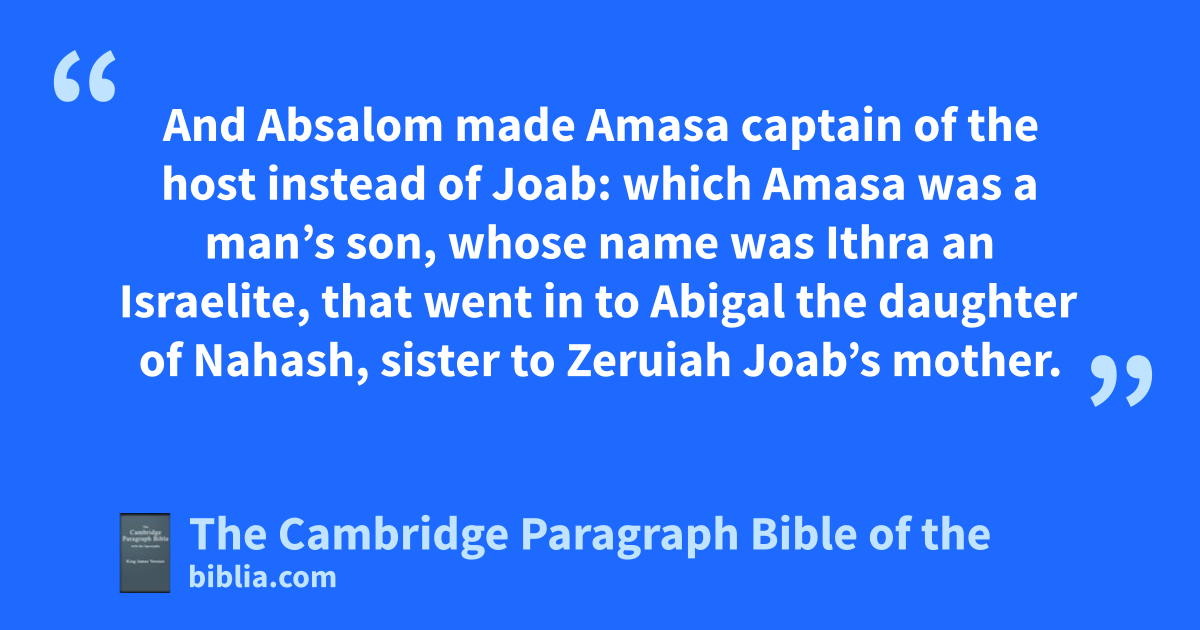 23 And when Ahithophel saw that his counsel was not * followed, he saddled his ass, and arose, and gat him home to his house, to rhis city, and * put his household in order, and shanged himself, and died, and was buried in the sepulchre of his father. 24 Then David came to tMahanaim. And Absalom passed over Jordan, he and all the men of Israel with him. 25 And Absalom made uAmasa captain of the host instead of Joab: which Amasa was a man’s son, whose name was * Ithra an Israelite, that went in to Abigal the daughter of * Nahash, sister to Zeruiah Joab’s mother. 26 So Israel and Absalom pitched in the land of Gilead. 27 And it came to pass, when David was come to Mahanaim, that wShobi the son of Nahash of Rabbah of the children of Ammon, and xMachir the son of Ammiel of yLo-debar, and zBarzillai the Gileadite of Rogelim, 28 brought beds, and * basons, and earthen vessels, and wheat, and barley, and flour, and parched corn, and beans, and lentiles, and parched pulse, 29 and honey, and butter, and sheep, and cheese of kine, for David, and for the people that were with him, to eat: for they said, The people is hungry, and aweary, and thirsty, bin the wilderness.