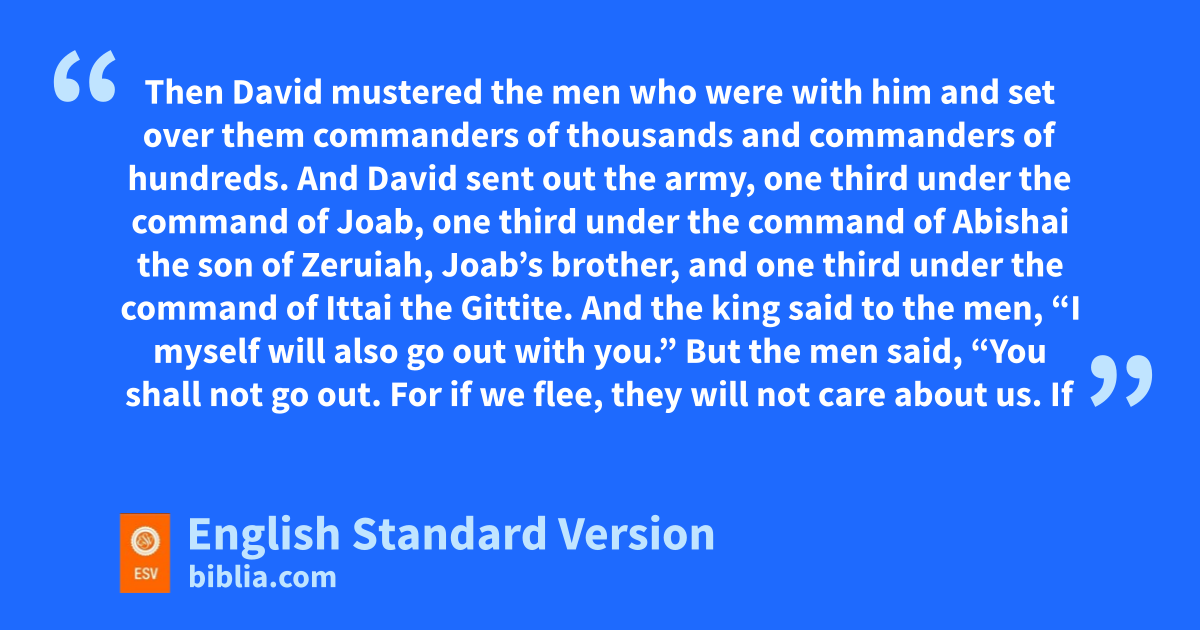 18 Then David mustered the men who were with him and set over them commanders of thousands and commanders of hundreds. 2 And David sent out the army, one third under the command of Joab, one third under the command of Abishai the son of Zeruiah, Joab’s brother, and one third under the command of sIttai the Gittite. And the king said to the men, “I myself will also go out with you.” 3 tBut the men said, “You shall not go out. For if we flee, they will not care about us. If half of us die, they will not care about us. But you are worth ten thousand of us. Therefore it is better that you send us help from the city.” 4 The king said to them, “Whatever seems best to you I will do.” So the king stood at the side of the gate, while all the army marched out by hundreds and by thousands. 5 And the king ordered Joab and Abishai and Ittai, “Deal gently for my sake with the young man Absalom.” uAnd all the people heard when the king gave orders to all the commanders about Absalom.