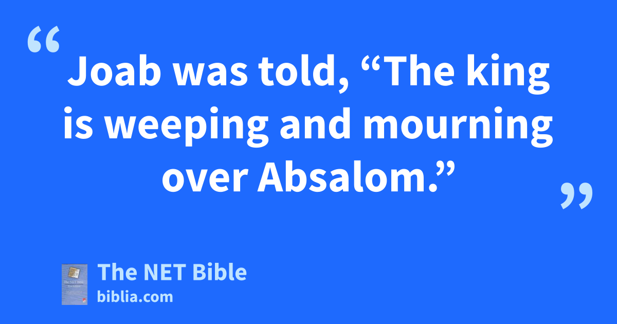 19:1 (19:2) Joab was told, “The king is weeping and mourning over Absalom.” 19:2 So the victory of that day was turned to mourning as far as all the people were concerned. For the people heard on that day, “The king is grieved over his son.” 19:3 That day the people stole away to go to the city the way people who are embarrassed steal away in fleeing from battle. 19:4 The king covered his face and cried out loudly,1 “My son, Absalom! Absalom, my son, my son!”