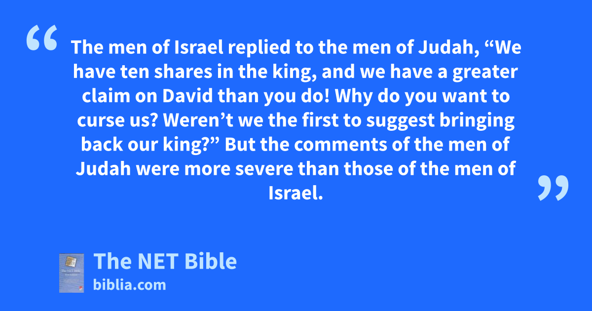 19:42 All the men of Judah replied to the men of Israel, “Because the king is our close relative! Why are you so upset about this? Have we eaten at the king’s expense?52 Or have we misappropriated anything for our own use?” 19:43 The men of Israel replied to the men of Judah, “We have ten shares in the king, and we have a greater claim on David than you do! Why do you want53 to curse us? Weren’t we the first to suggest bringing back our king?” But the comments of the men of Judah were more severe than those of the men of Israel.