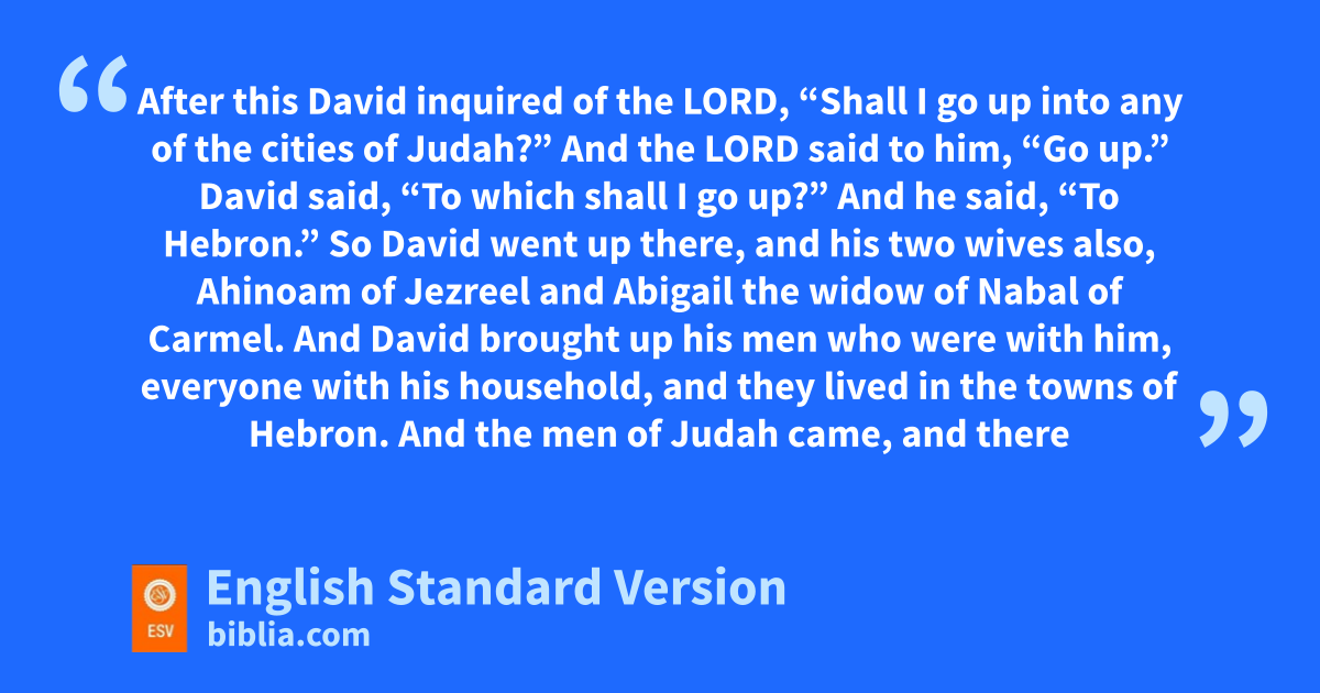 2 After this David einquired of the Lord, “Shall I go up into any of the cities of Judah?” And the Lord said to him, “Go up.” David said, “To which shall I go up?” And he said, “To fHebron.” 2 So David went up there, and ghis two wives also, Ahinoam of Jezreel and Abigail the widow of Nabal of Carmel. 3 And David brought up hhis men who were with him, everyone with his household, and they lived in the towns of Hebron. 4 And the men of Judah came, and there they anointed David iking over the house of Judah.