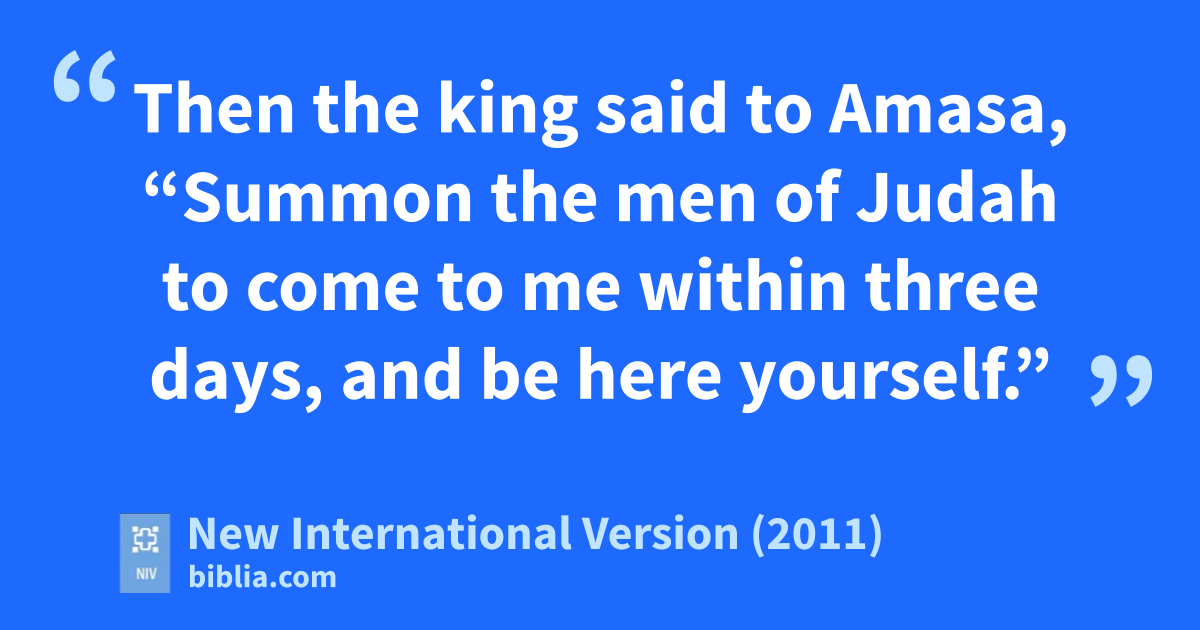4 Then the king said to Amasa,d “Summon the men of Judah to come to me within three days, and be here yourself.” 5 But when Amasa went to summon Judah, he took longer than the time the king had set for him.
