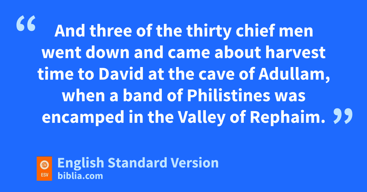 13 And three of the thirty chief men went down and came about harvest time to David at the wcave of Adullam, when a band of Philistines was encamped xin the Valley of Rephaim. 14 David was then yin the stronghold, and zthe garrison of the Philistines was then at Bethlehem. 15 And David said longingly, “Oh, that someone would give me water to drink from the well of Bethlehem that is by the gate!” 16 Then the three mighty men broke through the camp of the Philistines and drew water out of the well of Bethlehem that was by the gate and carried and brought it to David. But he would not drink of it. He poured it out to the Lord 17 and said, “Far be it from me, O Lord, that I should do this. Shall I drink athe blood of the men who went at the risk of their lives?” Therefore he would not drink it. These things the three mighty men did.
