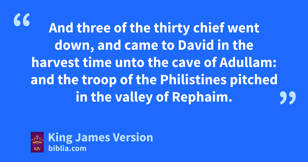 8 lThese be the names of the mighty men whom David had: ||The Tachmonite that sat in the seat, chief among mthe captains; the same was Adino the Eznite: ||he lift up his spear against eight hundred, †whom he slew at one time. 9 And after him was nEleazar the son of Dodo the Ahohite, one of the three mighty men with David, when othey defied the Philistines that were there gathered together to battle, and the men of Israel were gone away: 10 He arose, and smote the Philistines until his hand was weary, and his hand clave unto the sword: and the Lord wrought a great pvictory that day; and the people returned after him only to spoil. 11 And after him was qShammah the son of Agee the Hararite. And the Philistines were gathered together ||into a troop, where was a piece of ground full of lentiles: and the people fled from the Philistines. 12 But he stood in the midst of the ground, and defended it, and slew the Philistines: and the Lord wrought a great pvictory. 13 And ||three of the thirty chief went down, and came to David in the harvest time unto rthe cave of Adullam: and the troop of the Philistines pitched in sthe valley of Rephaim. 14 And David was then in tan hold, and uthe garrison of the Philistines was then in Beth-lehem. 15 And David longed, and said, Oh that one would give me drink of the water of the well of Beth-lehem, which is by the gate! 16 And the three mighty men brake through the host of the Philistines, and drew water out of the well of Beth-lehem, that was by the gate, and took it, and brought it to David: nevertheless he would not drink thereof, but poured it out unto the Lord. 17 And he said, Be it far from me, O Lord, that I should do this: is not this wthe blood of the men that went in jeopardy of their lives? therefore he would not drink it. These things did these three mighty men. 18 And Abishai, the brother of Joab, the son of Zeruiah, was chief among three. And he lifted up his spear against three hundred, †and slew them, and had the name among three. 19 Was he not most honourable of three? therefore he was their captain: howbeit he attained not unto the xfirst three. 20 And yBenaiah the son of Jehoiada, the son of a valiant man, of zKabzeel, †who had done many acts, he slew two †lionlike men of aMoab: he went down also and slew a lion in the midst of a pit in time of snow: 21 And he slew an Egyptian, †a goodly man: and the Egyptian had a spear in his hand; but he went down to him with a staff, and plucked the spear out of the Egyptian’s hand, and slew him with his own spear. 22 These things did Benaiah the son of Jehoiada, and had the name among three mighty men. 23 He was ||more honourable than the thirty, but he attained not to the bfirst three. And David set him over his ||guard.