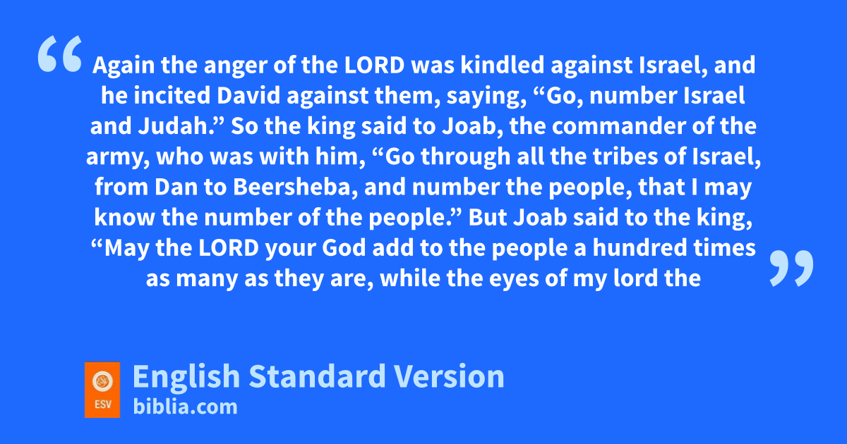 24 zaAgain the anger of the Lord was kindled against Israel, and he incited David against them, saying, b“Go, number Israel and Judah.” 2 So the king said to Joab, the commander of the army,1 who was with him, “Go through all the tribes of Israel, cfrom Dan to Beersheba, and number the people, that I may know the number of the people.” 3 But Joab said to the king, d“May the Lord your God add to the people a hundred times as many as they are, while the eyes of my lord the king still see it, but why does my lord the king delight in this thing?” 4 But the king’s word prevailed against Joab and the commanders of the army. So Joab and the commanders of the army went out from the presence of the king to number the people of Israel. 5 They crossed the Jordan and began from eAroer,2 and from the city that is in the middle of the fvalley, toward Gad and on to gJazer. 6 Then they came to Gilead, and to Kadesh in the land of the Hittites;3 and they came to Dan, and from Dan4 they went around to hSidon, 7 and came to the fortress of Tyre and to all the cities of the iHivites and iCanaanites; and they went out to the Negeb of Judah at Beersheba. 8 So when they had gone through all the land, they came to Jerusalem at the end of nine months and twenty days. 9 And Joab gave the sum of the numbering of the people to the king: in Israel there were 800,000 valiant men jwho drew the sword, and the men of Judah were 500,000.