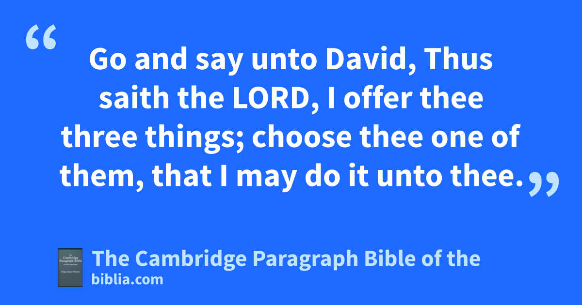 10 And nDavid’s heart smote him after that he had numbered the people. And David said unto the Lord, oI have sinned greatly in that I have done: and now, I beseech thee, O Lord, take away the iniquity of thy servant; for I have pdone very foolishly. 11 For when David was up in the morning, the word of the Lord came unto the prophet qGad, David’s rseer, saying, 12 Go and say unto David, Thus saith the Lord, I offer thee three things; choose thee one of them, that I may do it unto thee. 13 So Gad came to David, and told him, and said unto him, Shall sseven years of famine come unto thee in thy land? or wilt thou flee three months before thine enemies, while they pursue thee? or that there be three days’ pestilence in thy land? now advise, and see what answer I shall return to him that sent me. 14 And David said unto Gad, I am in a great strait: let us fall now into the hand of the Lord; for his mercies are * great: and let me not fall into the hand of man. 15 So the Lord sent a pestilence upon Israel from the morning even to the time appointed: and there died of the people tfrom Dan even to Beer-sheba seventy thousand men.