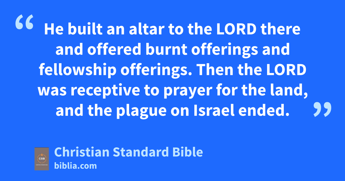 24 The king answered Araunah, “No, I insist on buying it from you for a price, for I will not offer to the Lord my God burnt offerings that cost me nothing.” David bought the threshing floor and the oxen for twenty ouncesD of silver. 25 He built an altar to the Lord there and offered burnt offerings and fellowship offerings. Then the Lord was receptive to prayer for the land,c and the plague on Israel ended.